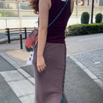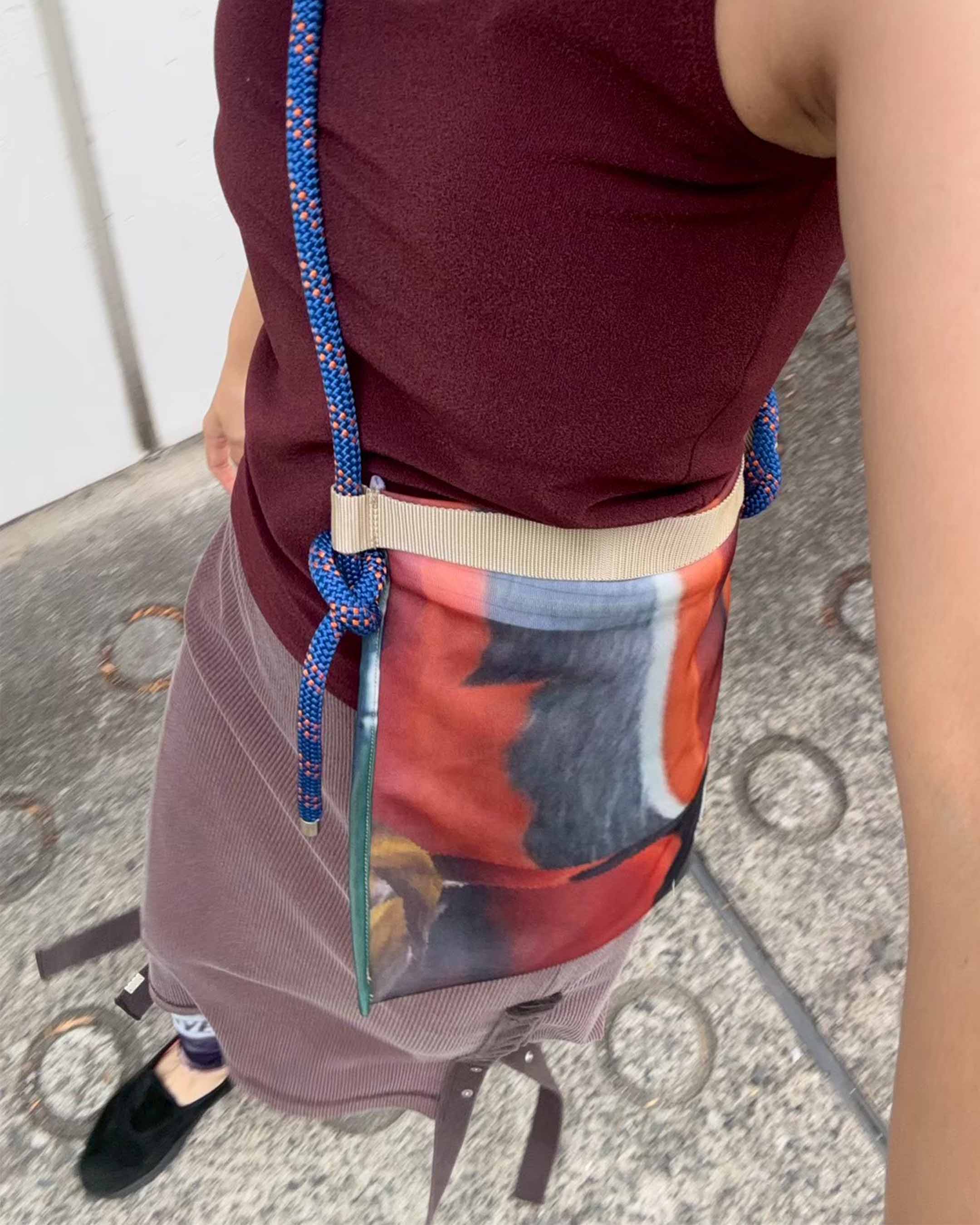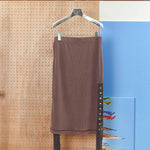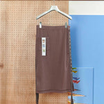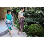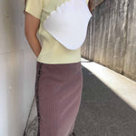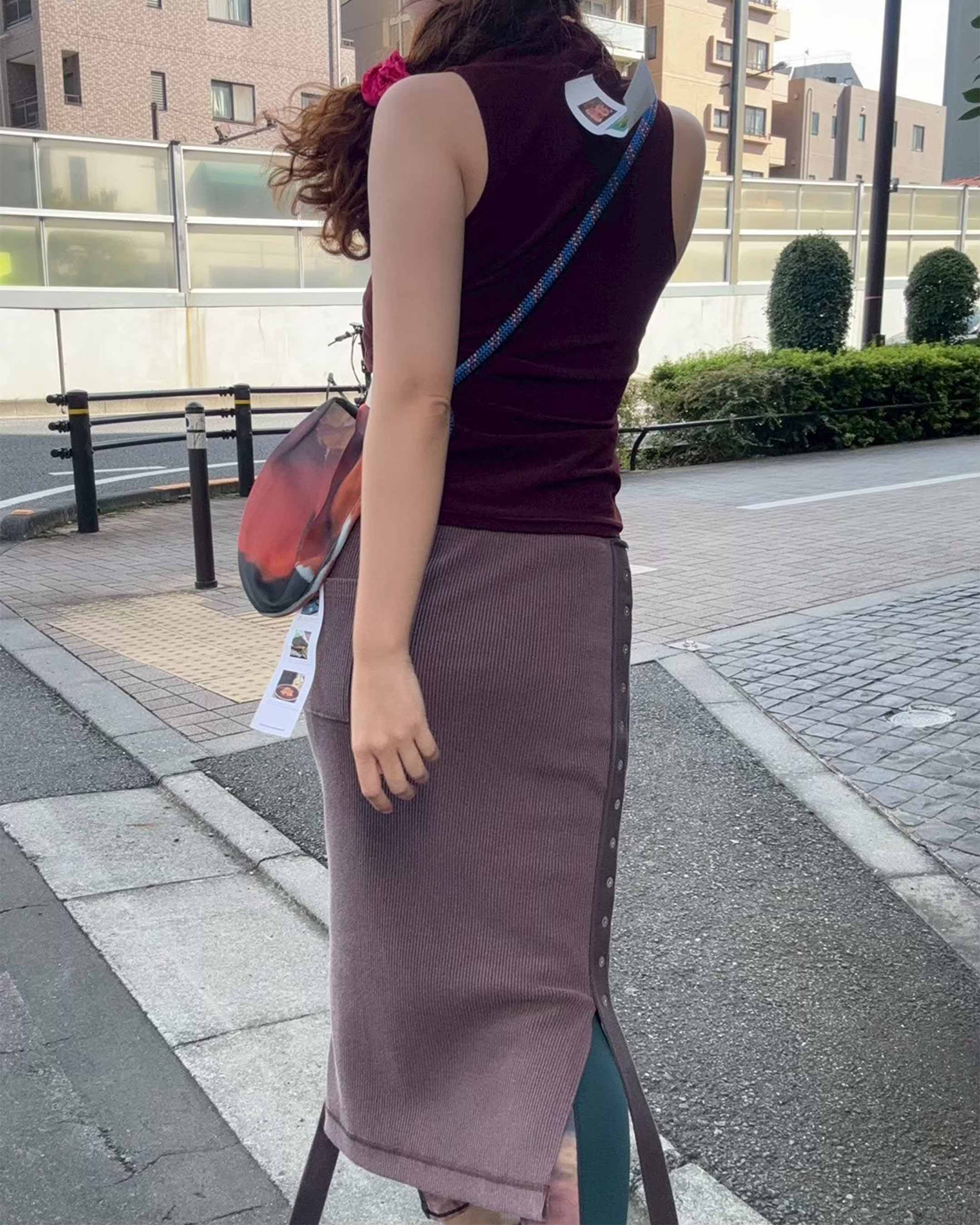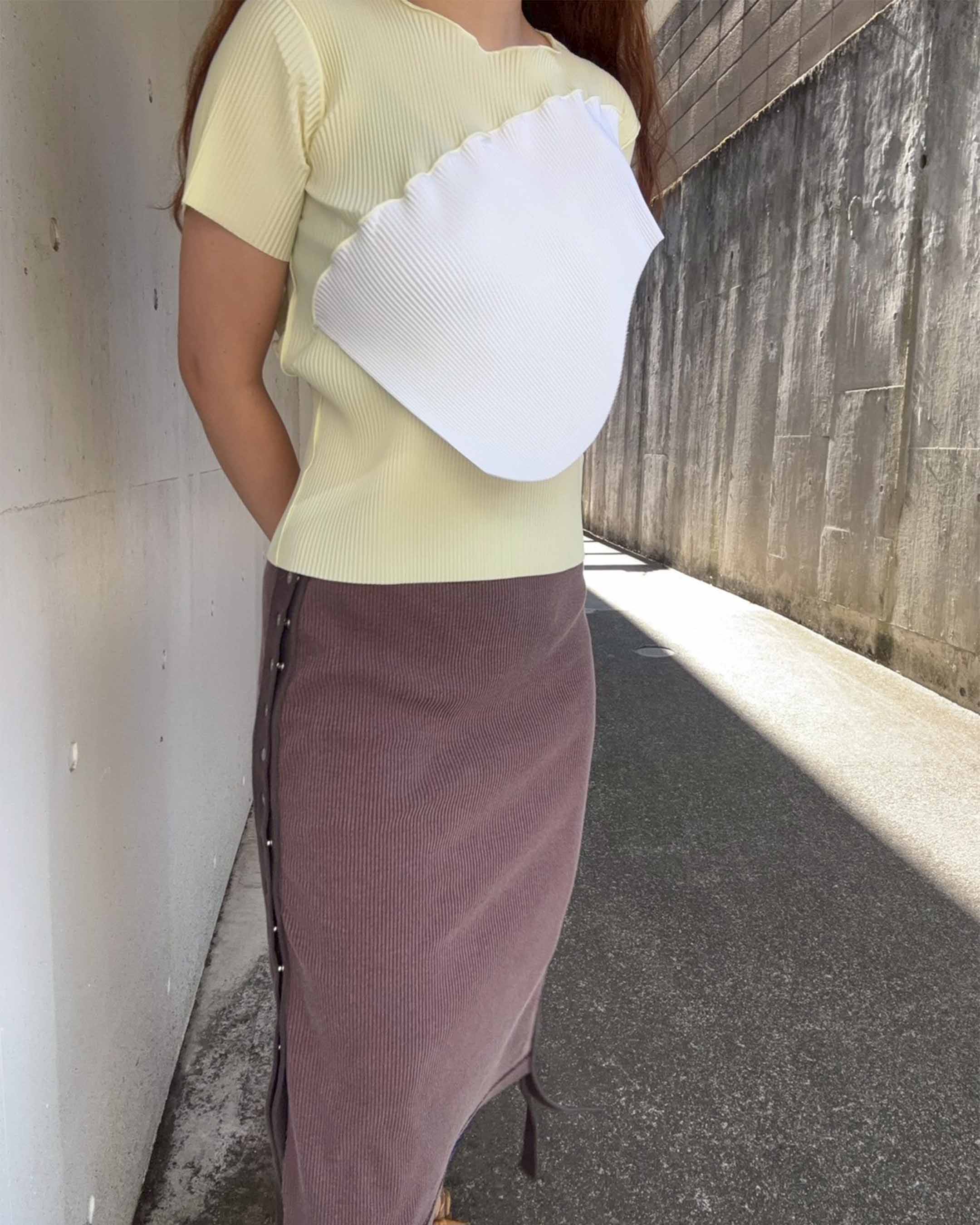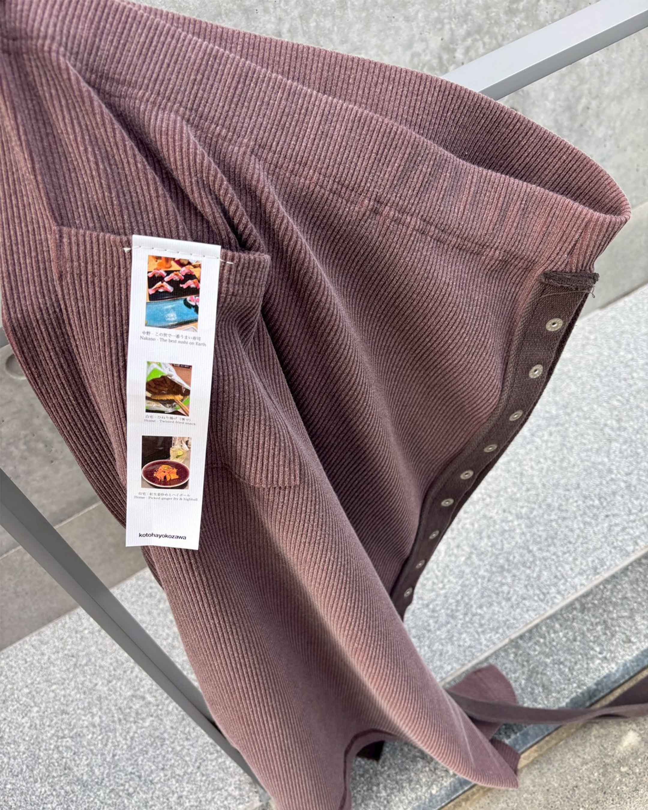 顔料インクでヴィンテージ加工を施したリブ地に、ストーンウォッシュ加工のヘビーウェイト綿テープをアクセントとして使用。本体の生地とテープの質感が絶妙にマッチし、テープ先にはオリジナルのメタルクリップを取り付けています。このスカートはパンツやショーツと重ね履きして、スナップを全開にして履くのもおすすめです。