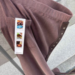 Pigment-dyed vintage rib fabric with stone-washed heavyweight cotton tape accent. An original metal clip completes the tape detail. Layer it over pants or shorts and leave the snaps fully open like an apron for a playful look.
