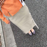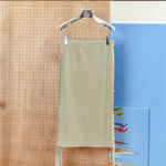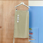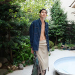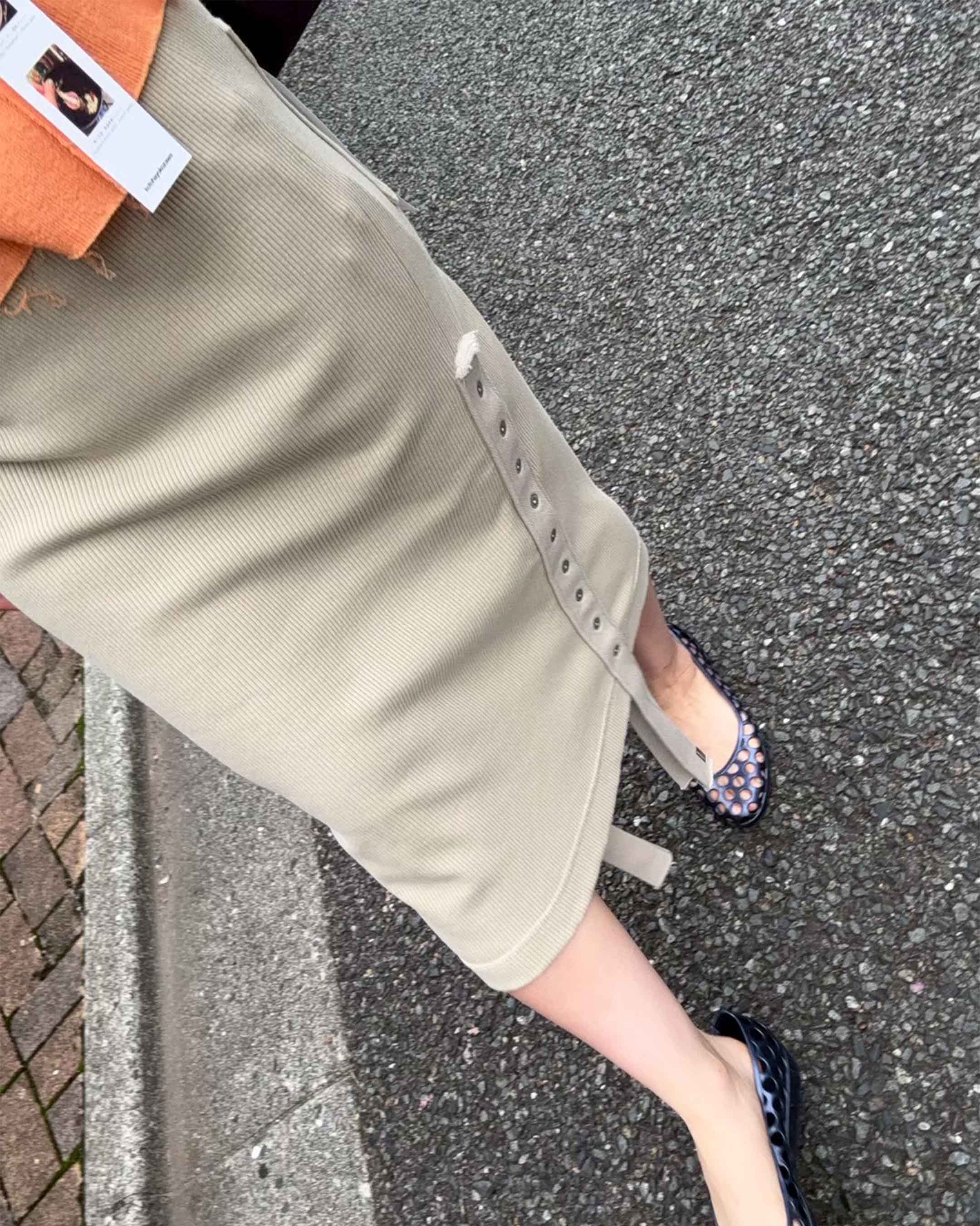 顔料インクでヴィンテージ加工を施したリブ地に、ストーンウォッシュ加工のヘビーウェイト綿テープをアクセントとして使用。本体の生地とテープの質感が絶妙にマッチし、テープ先にはオリジナルのメタルクリップを取り付けています。このスカートはパンツやショーツと重ね履きして、スナップを全開にして履くのもおすすめです。