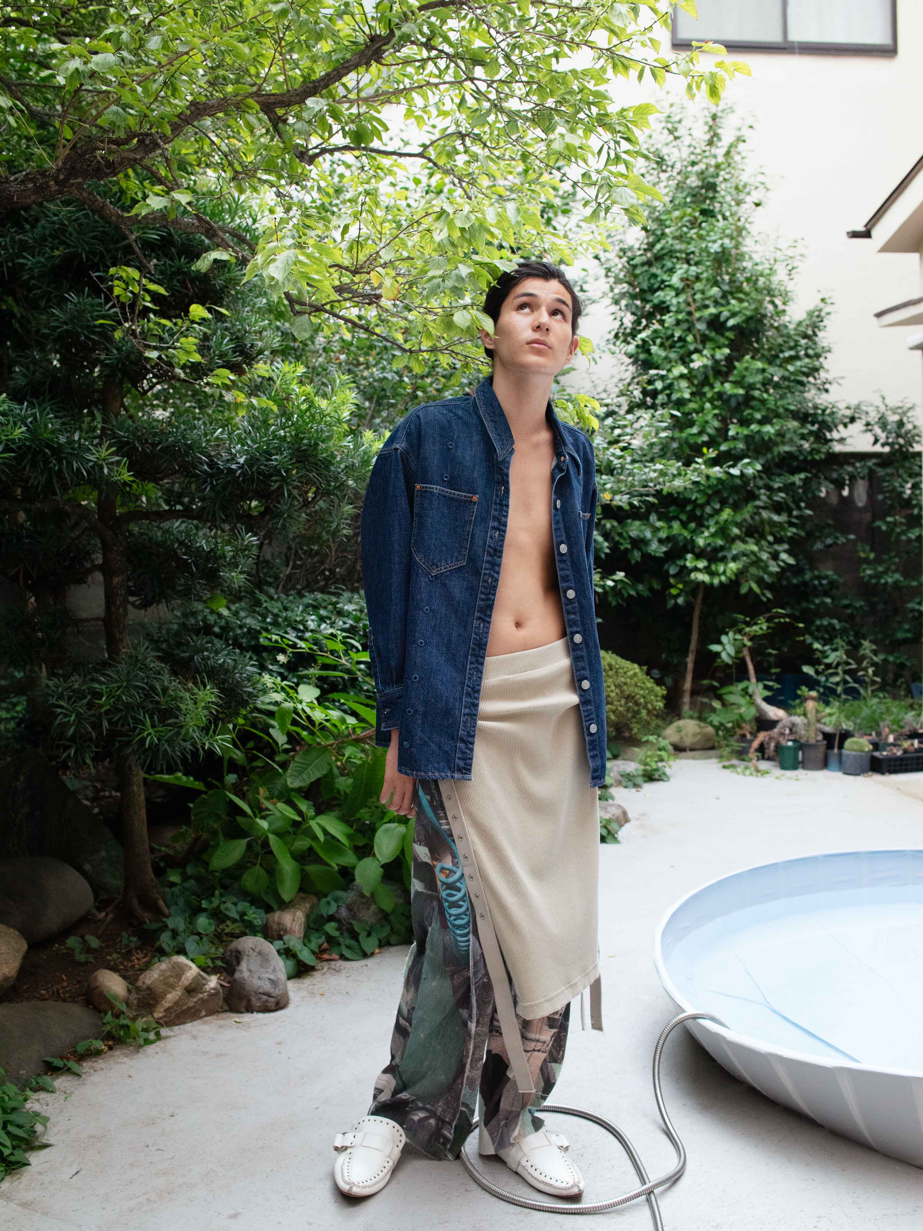 Pigment-dyed vintage rib fabric with stone-washed heavyweight cotton tape accent. An original metal clip completes the tape detail. Layer it over pants or shorts and leave the snaps fully open like an apron for a playful look.