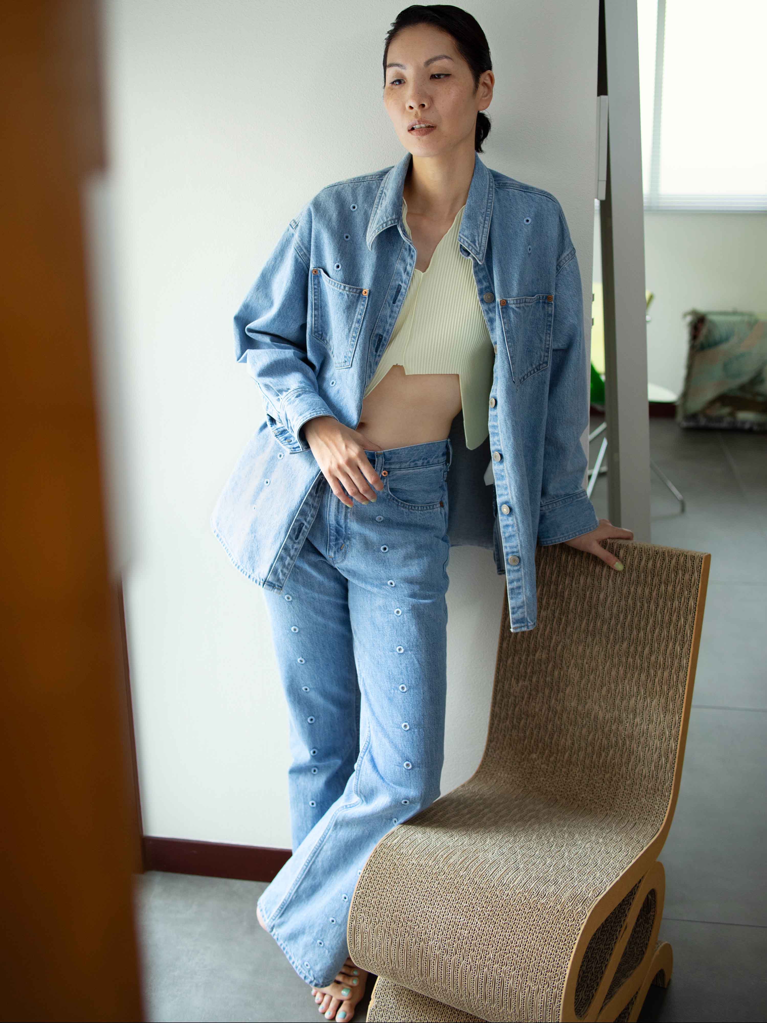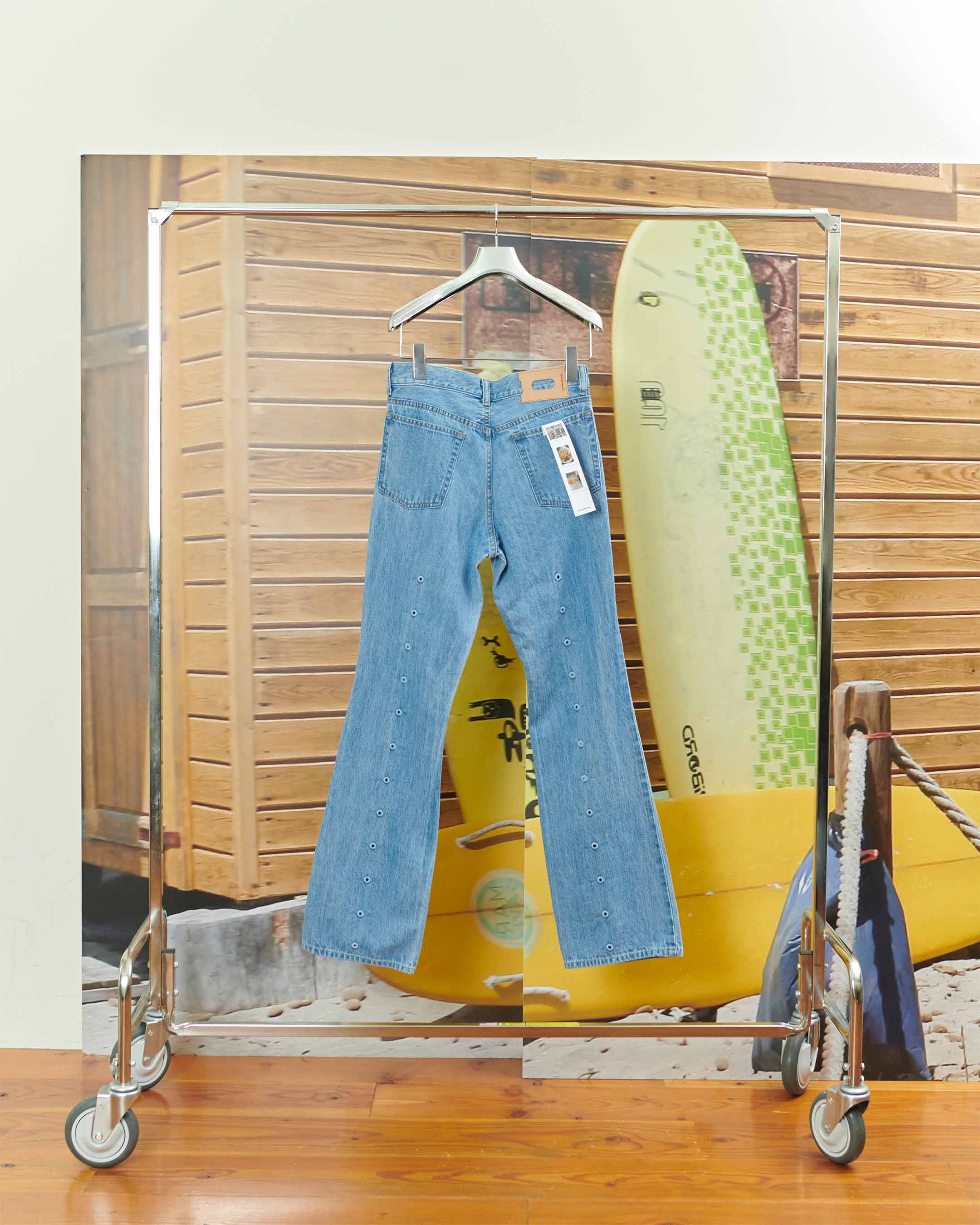 SSのジーンズに欠かせないのは通気性。前後にずらりと並べた菊穴刺繍のおかげで、これがあるのと無いのとでは快適さがまったく違います。フロントはジップフライ仕様。(腰回りをすっきり見せるために、いついかなるときもジップフライ派です。)