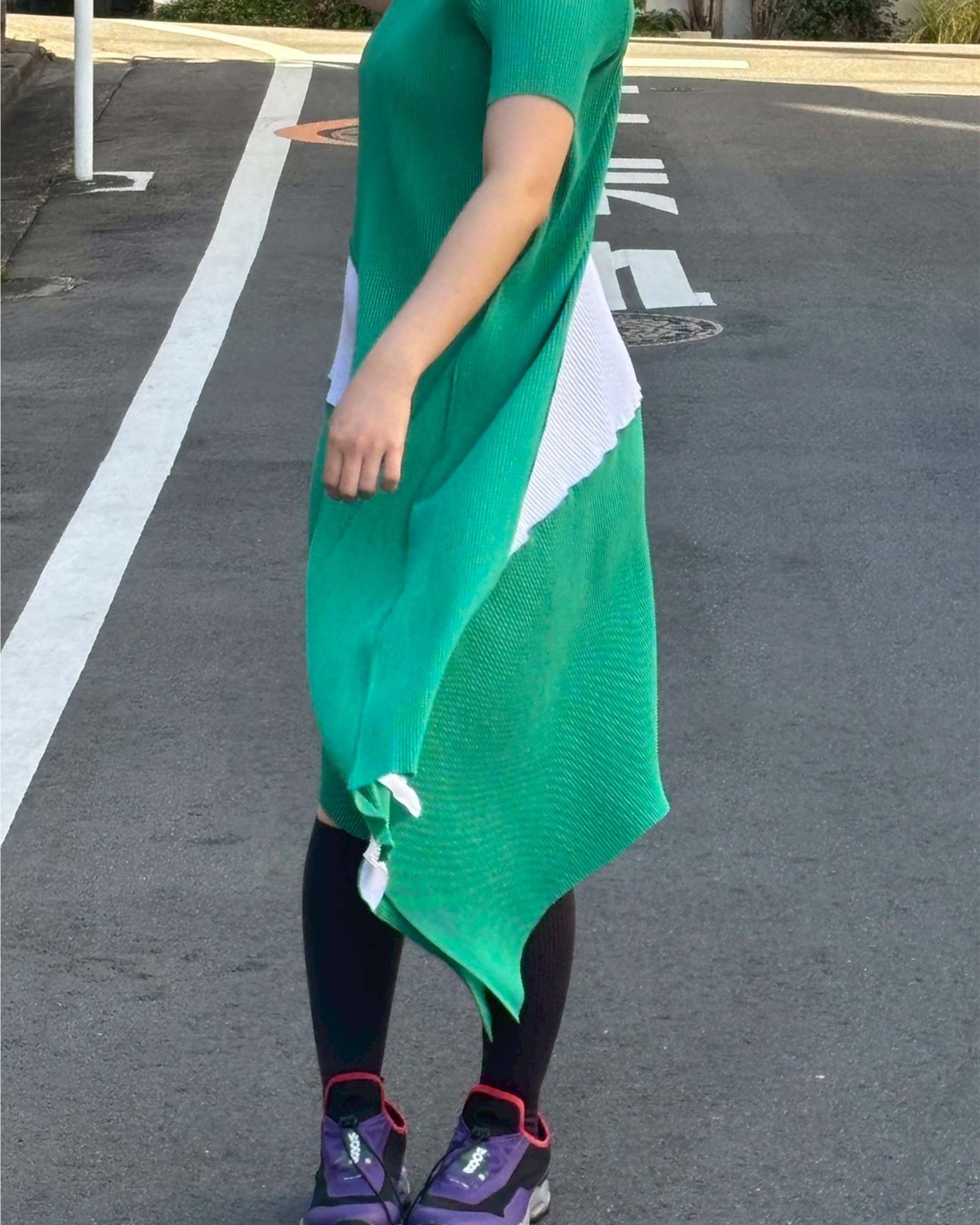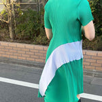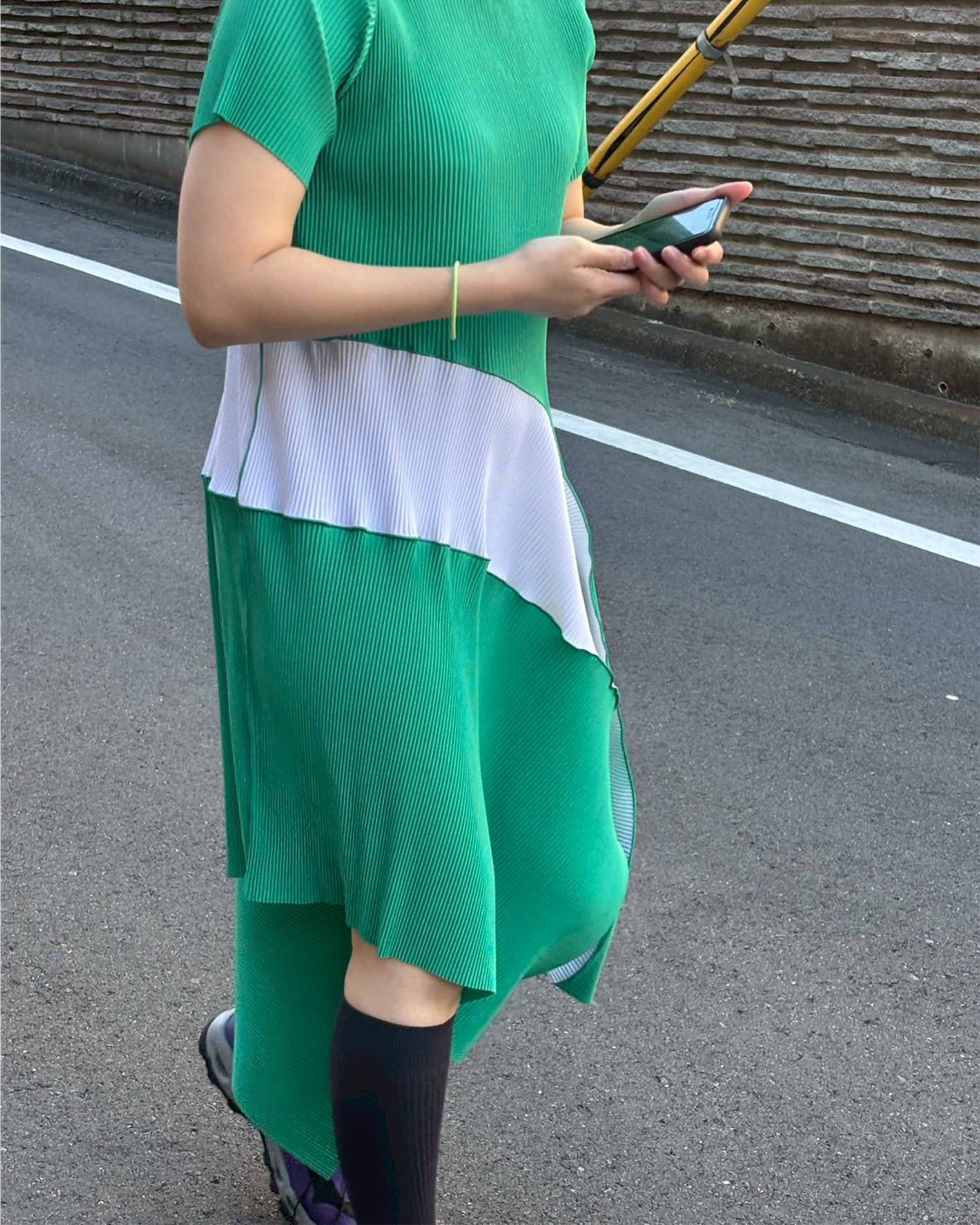 Made from recycled polyester sourced from collected plastic bottles. Pleated dense polyester, comfortable for any body shape. Wrinkle-resistant and quick-drying, perfect for travel and everyday wear.