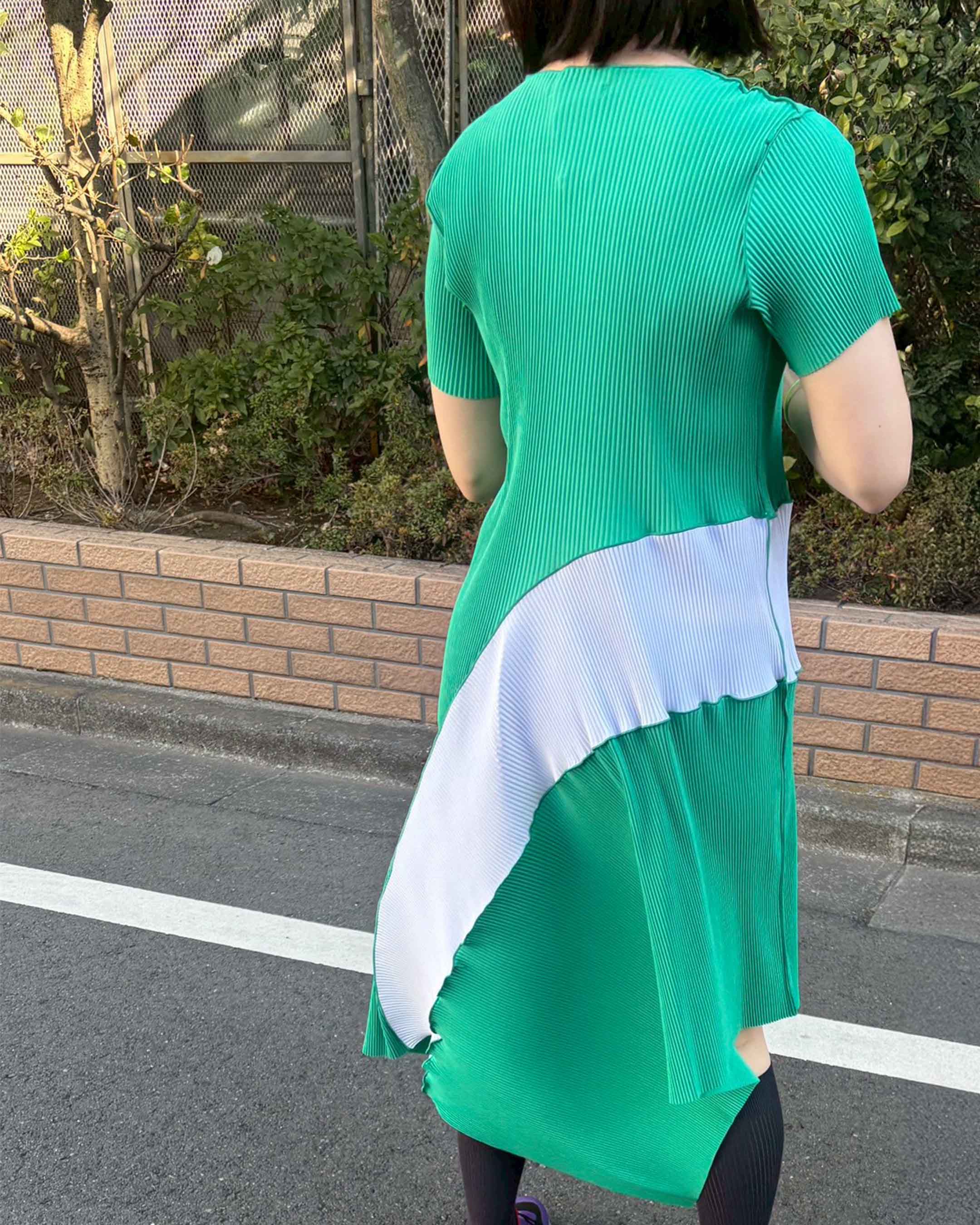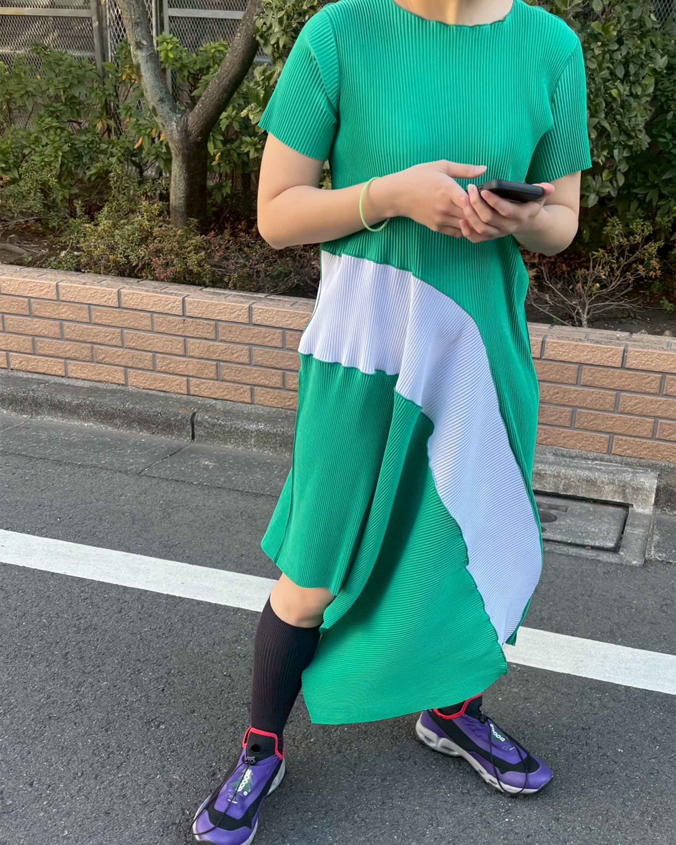 素材は回収されたペットボトルを原料としたリサイクルポリエステル生地を使用。プリーツ加工がされており伸縮性があるので、体型を選ばず、さらっとした着心地です。プリーツ方向にくるくるとまとめればシワもつきにくく、速乾性に優れており、旅行などにもピッタリです。