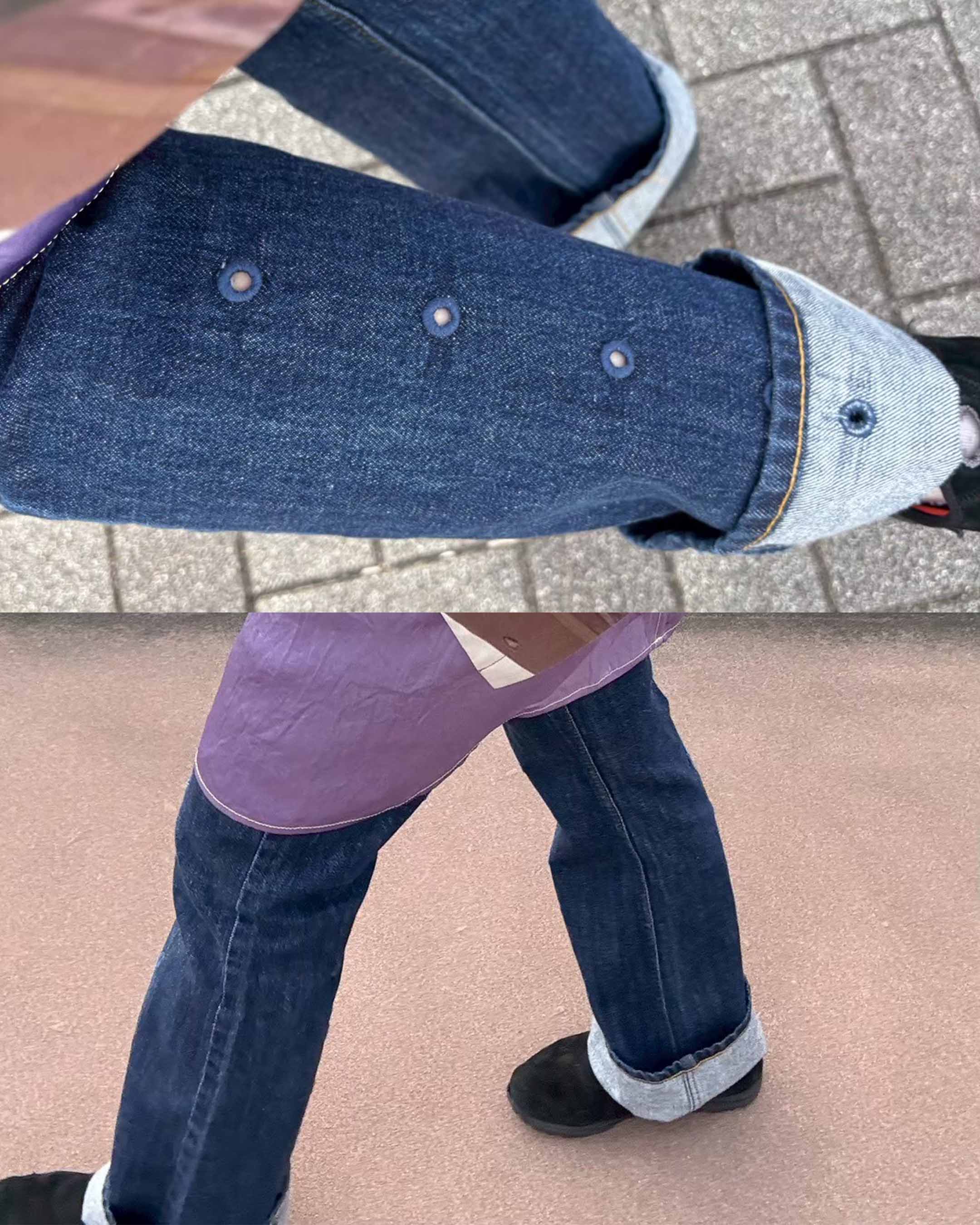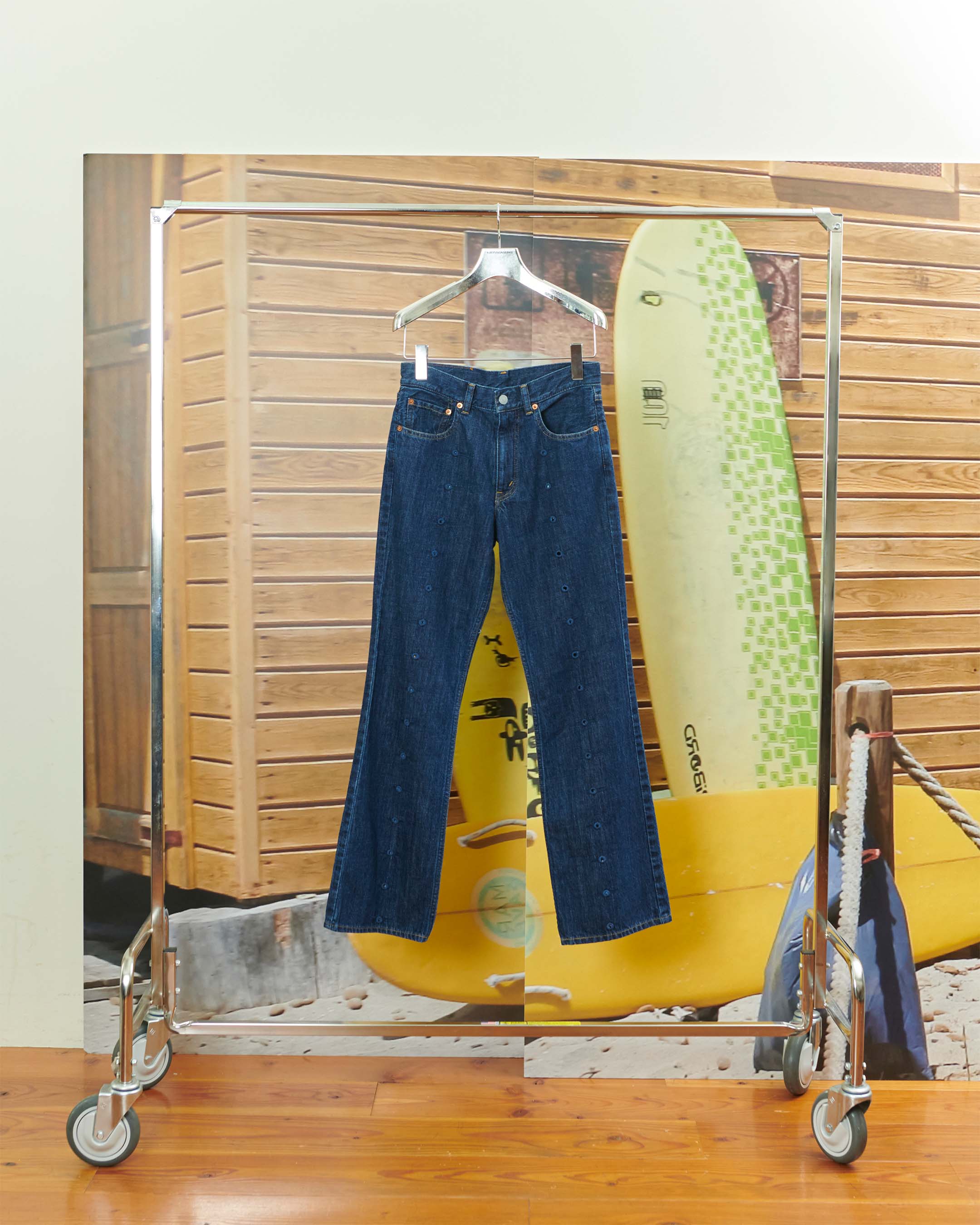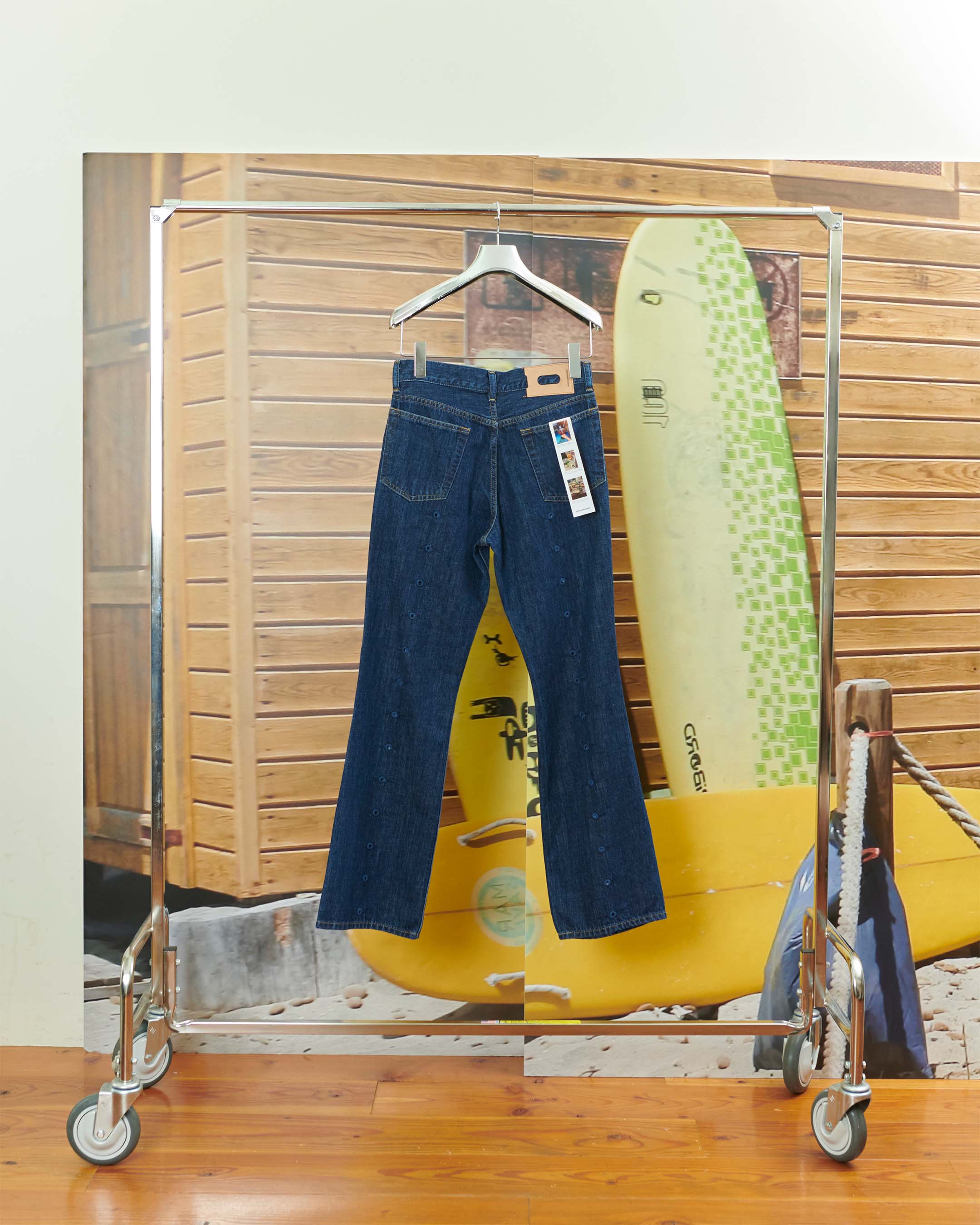 SSのジーンズに欠かせないのは通気性。前後にずらりと並べた菊穴刺繍のおかげで、これがあるのと無いのとでは快適さがまったく違います。フロントはジップフライ仕様。(腰回りをすっきり見せるために、いついかなるときもジップフライ派です。)