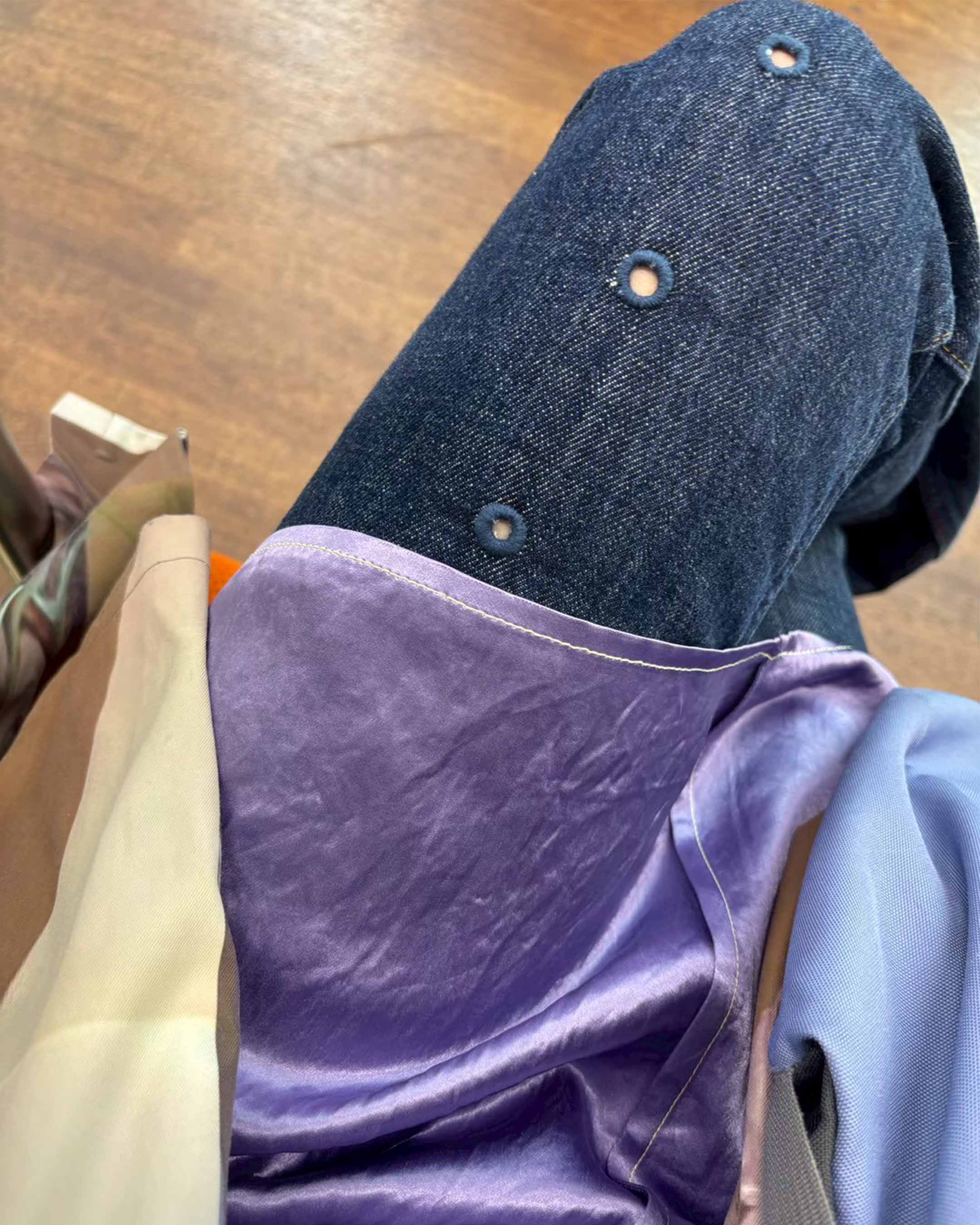 後身頃に縫い付けてあるリサイクルレザーラベルの中にはステッカーが入っています。洗濯やクリーニングの際はステッカーを取り出してください。また、アイロンもお避けください。