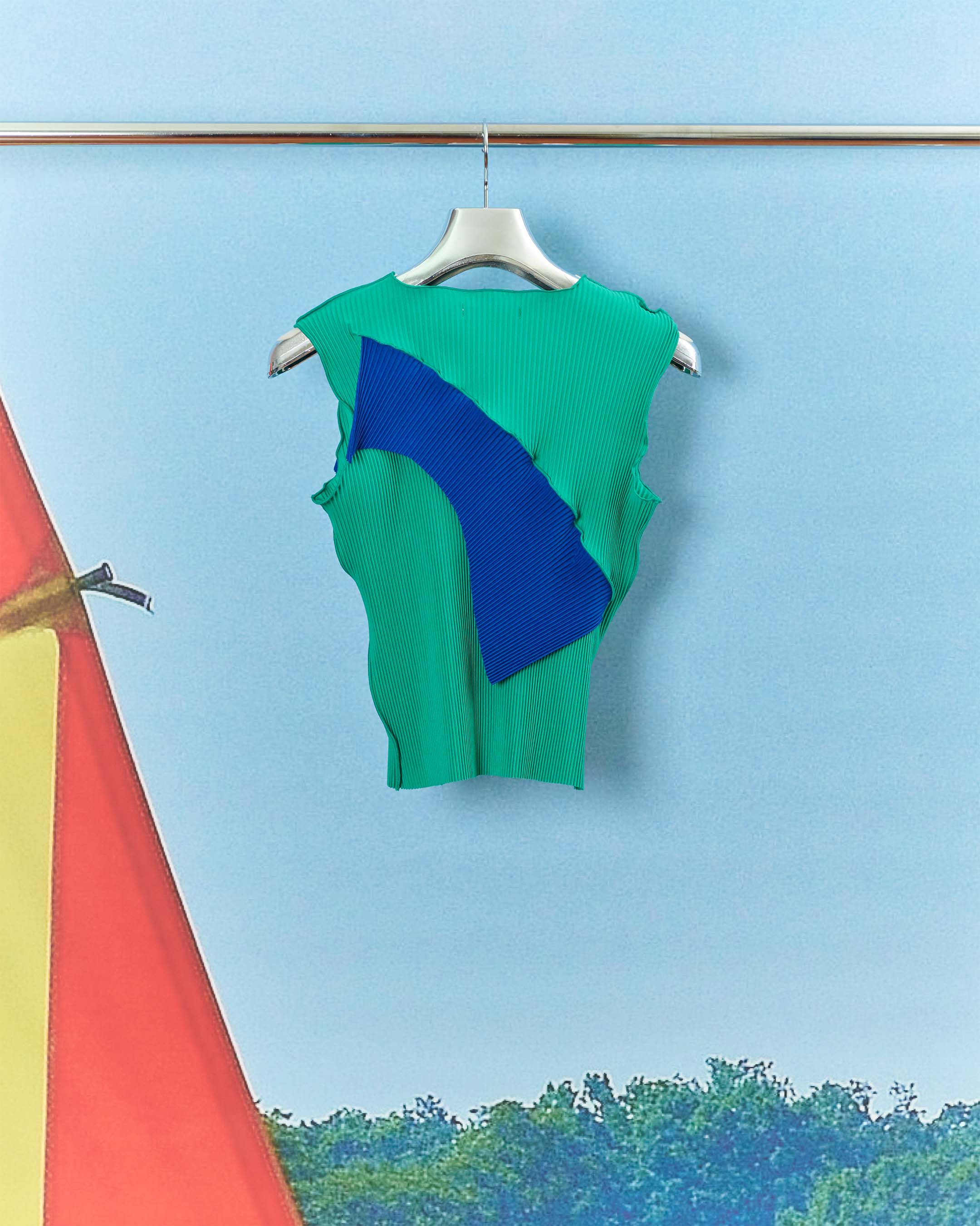 Made from recycled polyester sourced from collected plastic bottles. Pleated dense polyester, comfortable for any body shape. Wrinkle-resistant and quick-drying, perfect for travel and everyday wear.