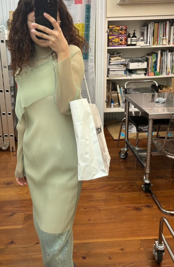 A sheer overlay long-sleeve dress with a built-in inner, stitched at the shoulders. No need to layer—just wear as is. High-neck design. Comes in four colors: moody SMOKE MINT, bright LIME and ORANGE, and timeless BLACK.