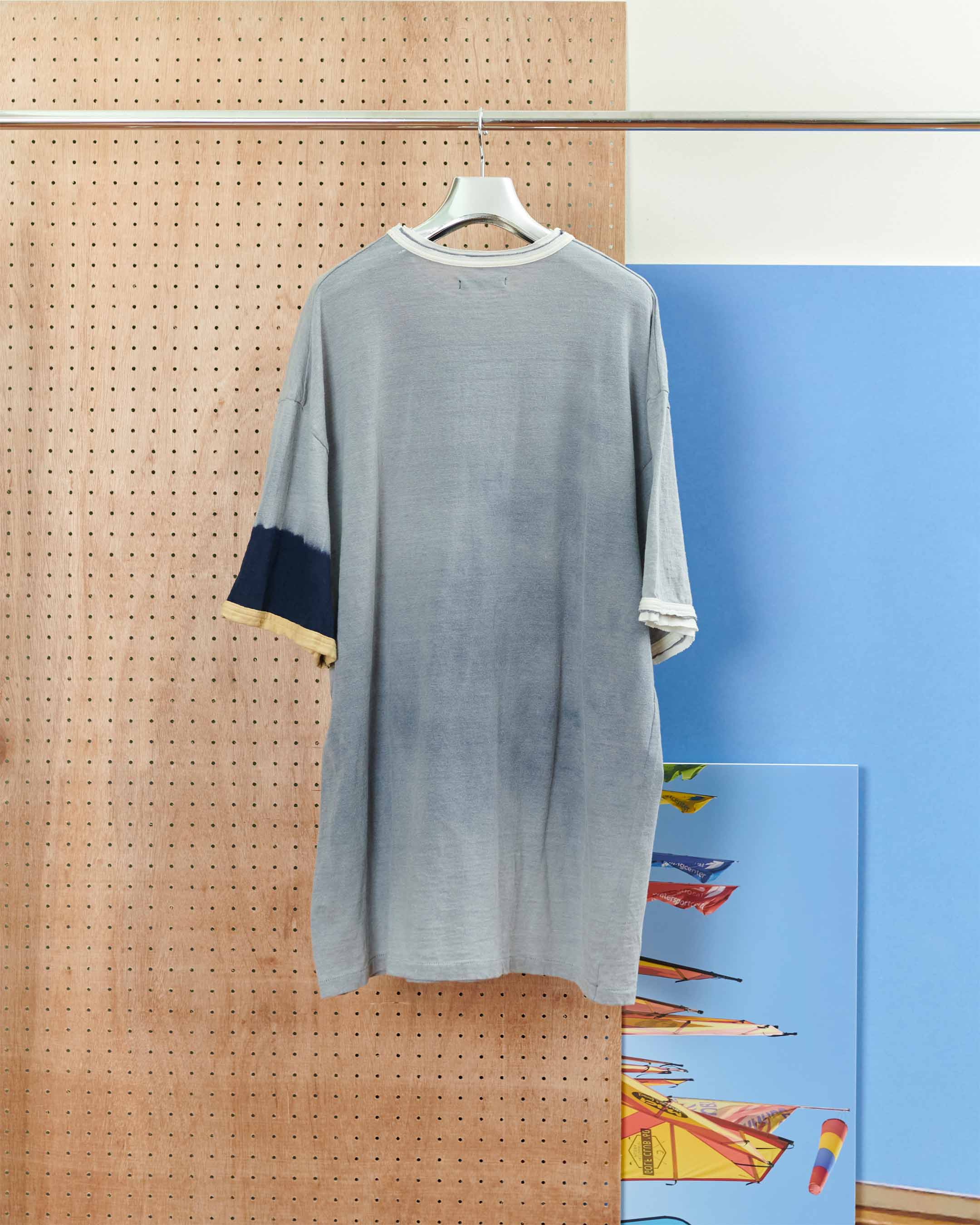 片袖の半分はあえて加工せず、オリジナルの生地色を残したツートーンのような表情に。手作業による加工なので、1点ごとに色合いやニュアンスが微妙に異なり、自分だけの1枚に出会えるのもこのシリーズならではの醍醐味。加工部分のリブだけ擦り切れたような仕様なのが味わいポイント。