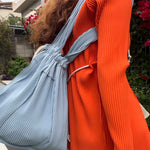 持ち方を変えることでナップサックのようにも使用できるマルチウェイ仕様。落ち着いた色合いとザクザクした5mmプリーツの質感は、いつものコーディネートのアクセントにも最適。
