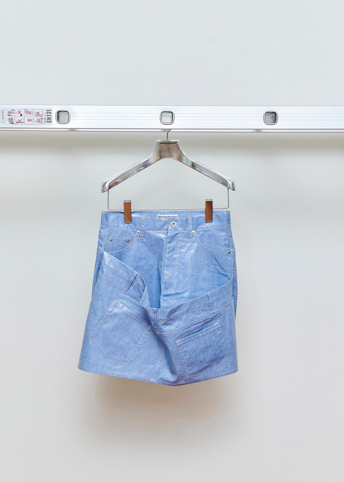 箔加工を施しているため、ビニールのような、濡れたような素材感が特徴のスカート。ベーシックな形のミニスカートに後ろ身頃のスカートがダブって見えるような、違和感を覚えるデザインが印象的な一着。
