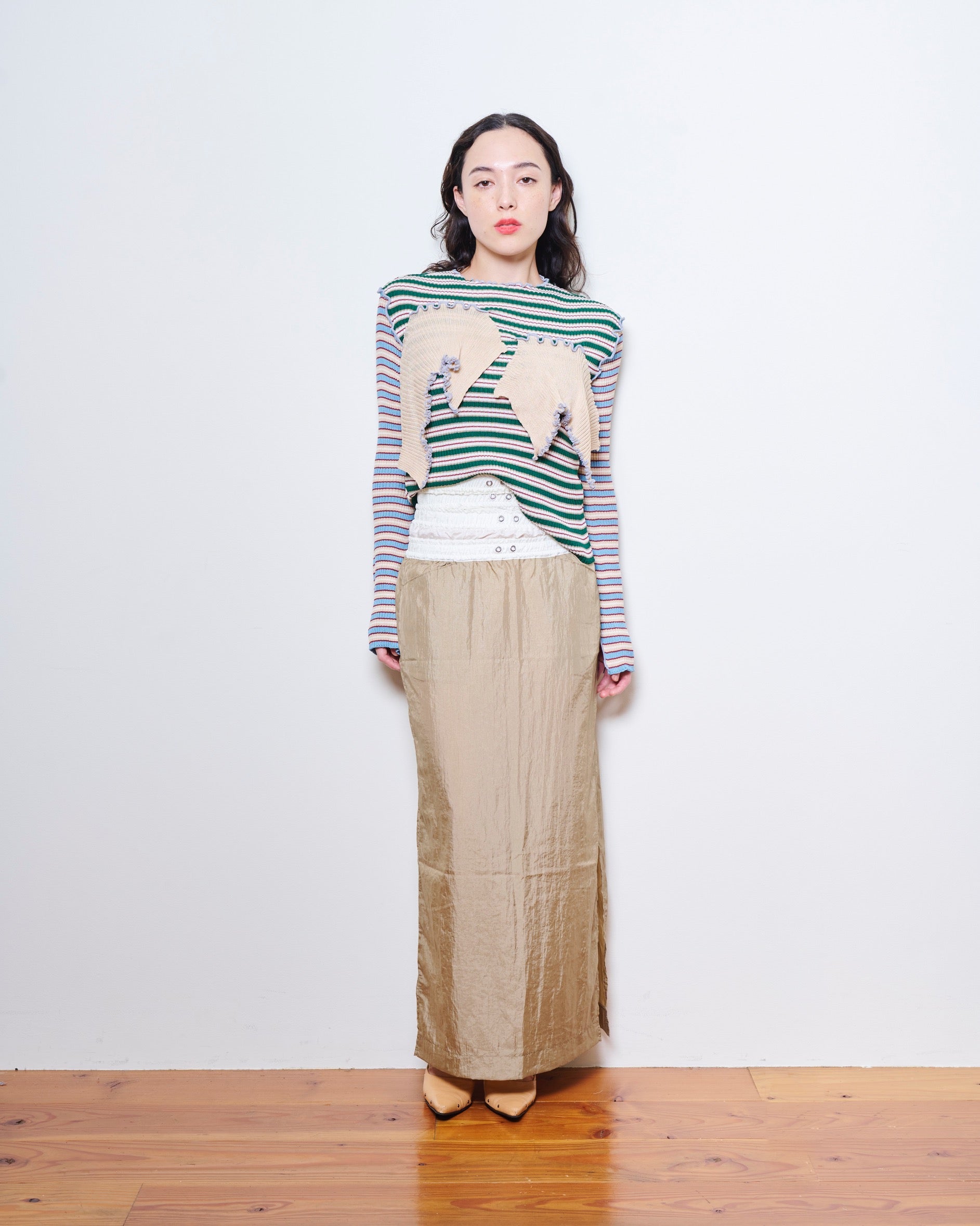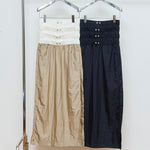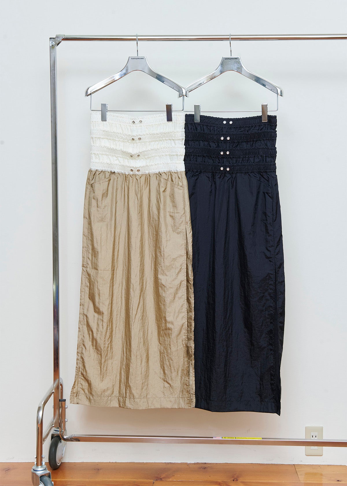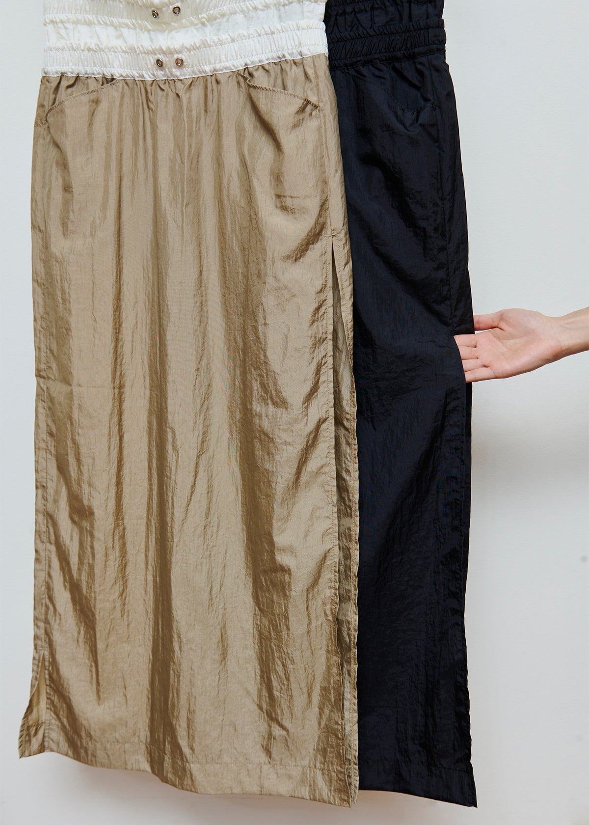 Sheeny nylon maxi skirt with a four-layered waist design.