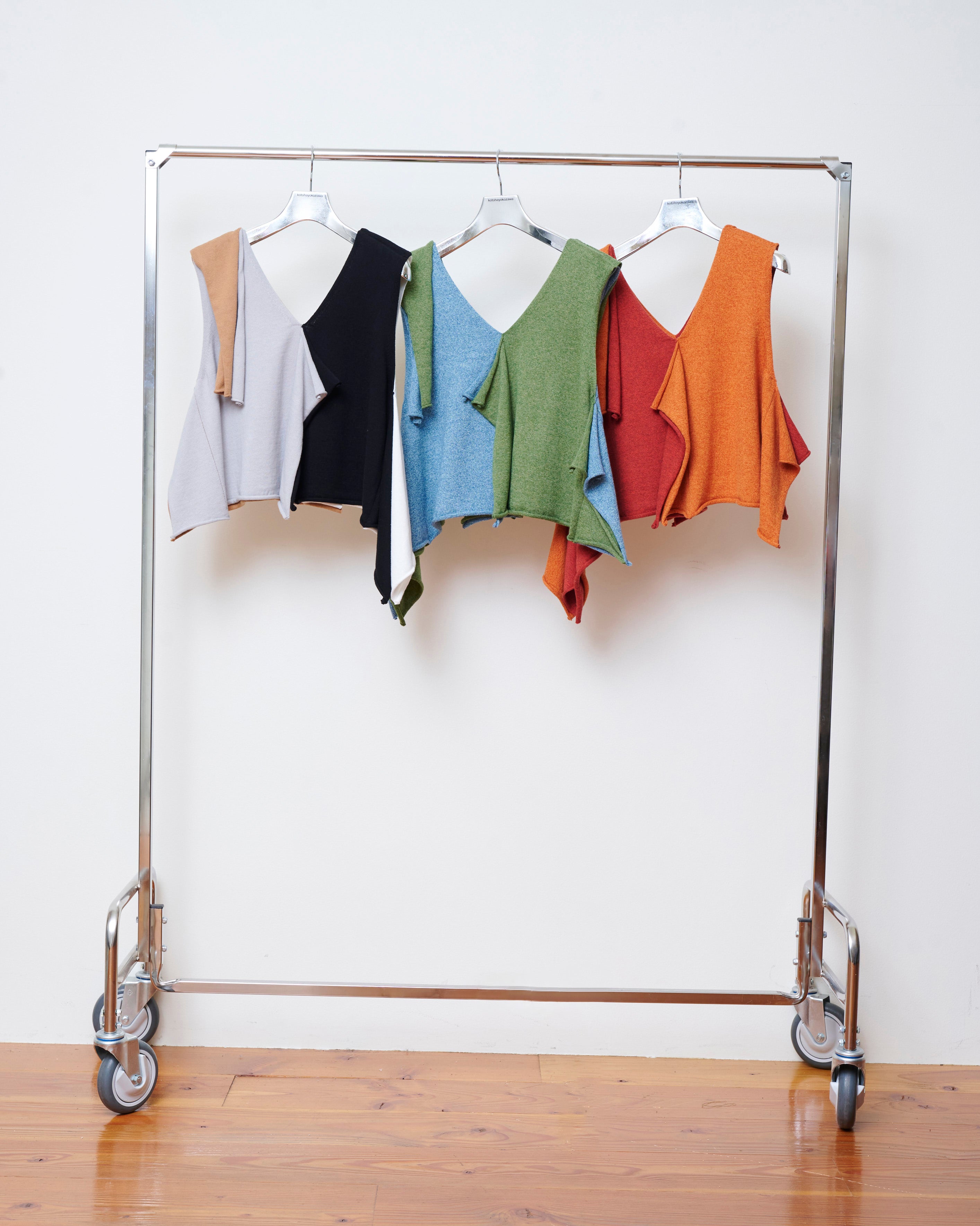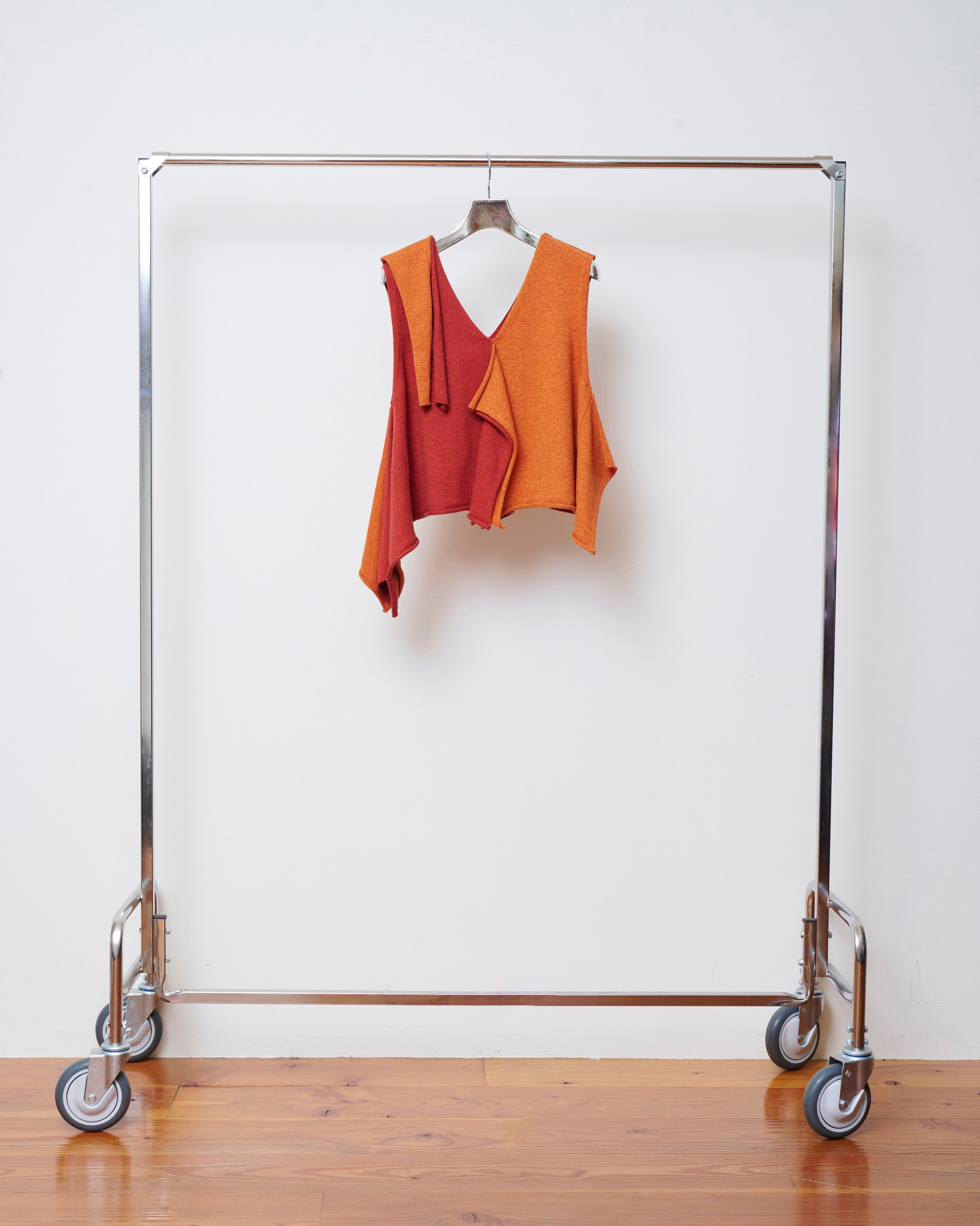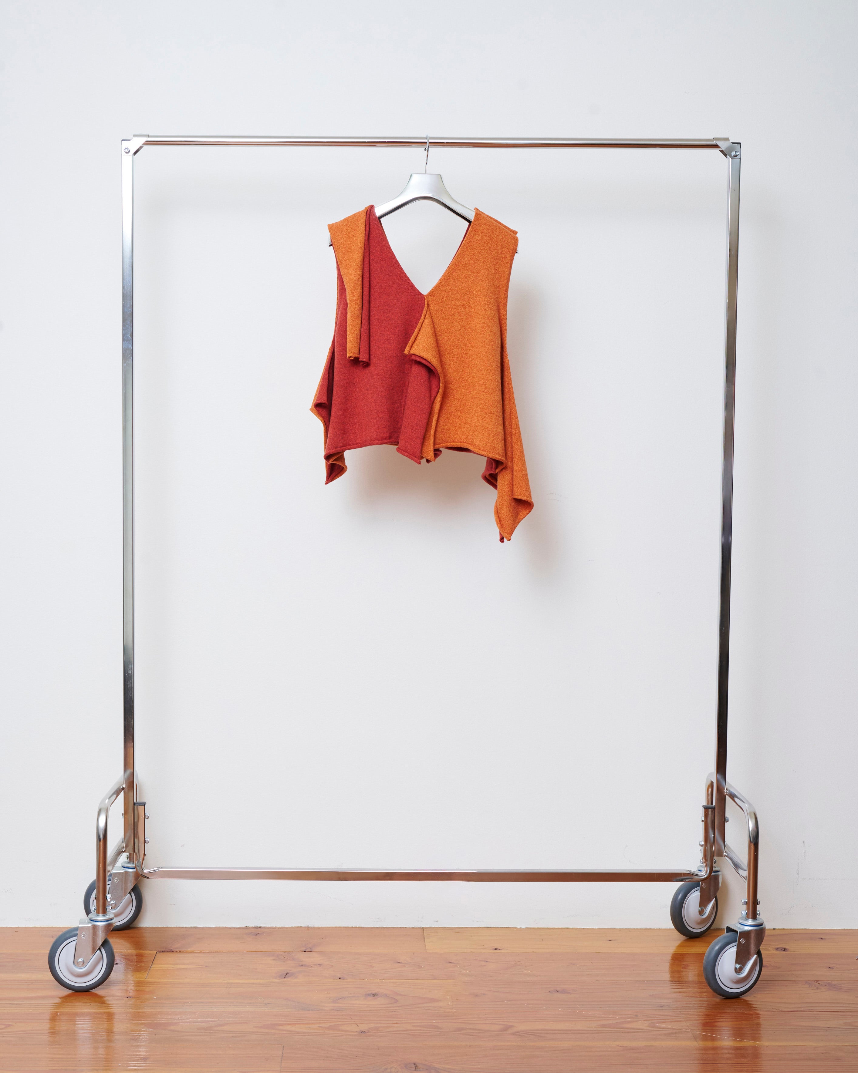 前後ろ中心、両肩、両脇から大きく縫い代が伸びたようなデザインで、どの角度から見てもハッとするような異なる印象を与えます。KN02のロング丈で、サイドは腰あたりでスリットが入っており、ショートパンツに合わせてドレス風にしたり、ロング丈のボトムスをレイヤードしてスタイリングを楽しんでいただけます。フロント左身頃はカラーブロックになっていたり、前後ろで異なる配色で2WAY仕様に。