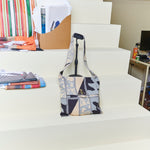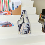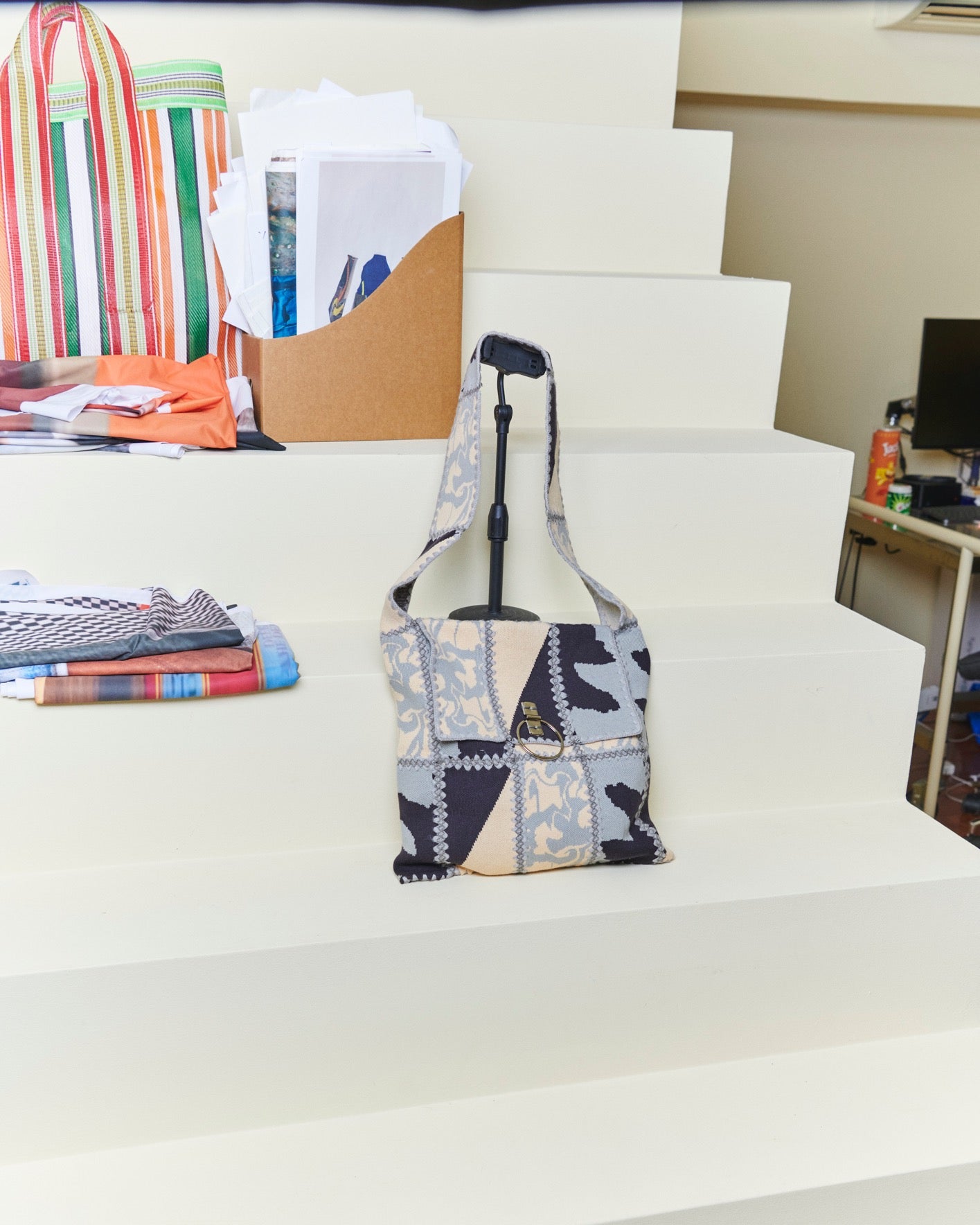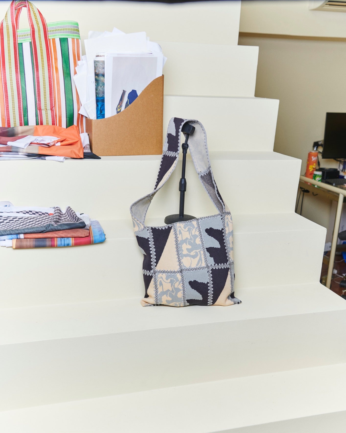 ジャガード編みのニットパーツを繋ぎ合わせたバッグ。