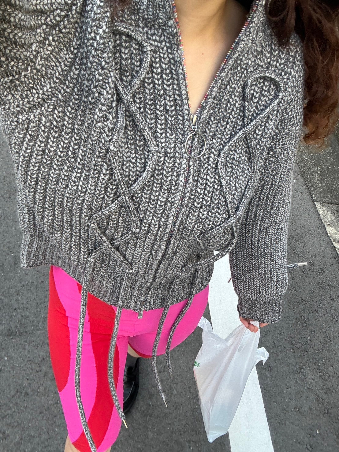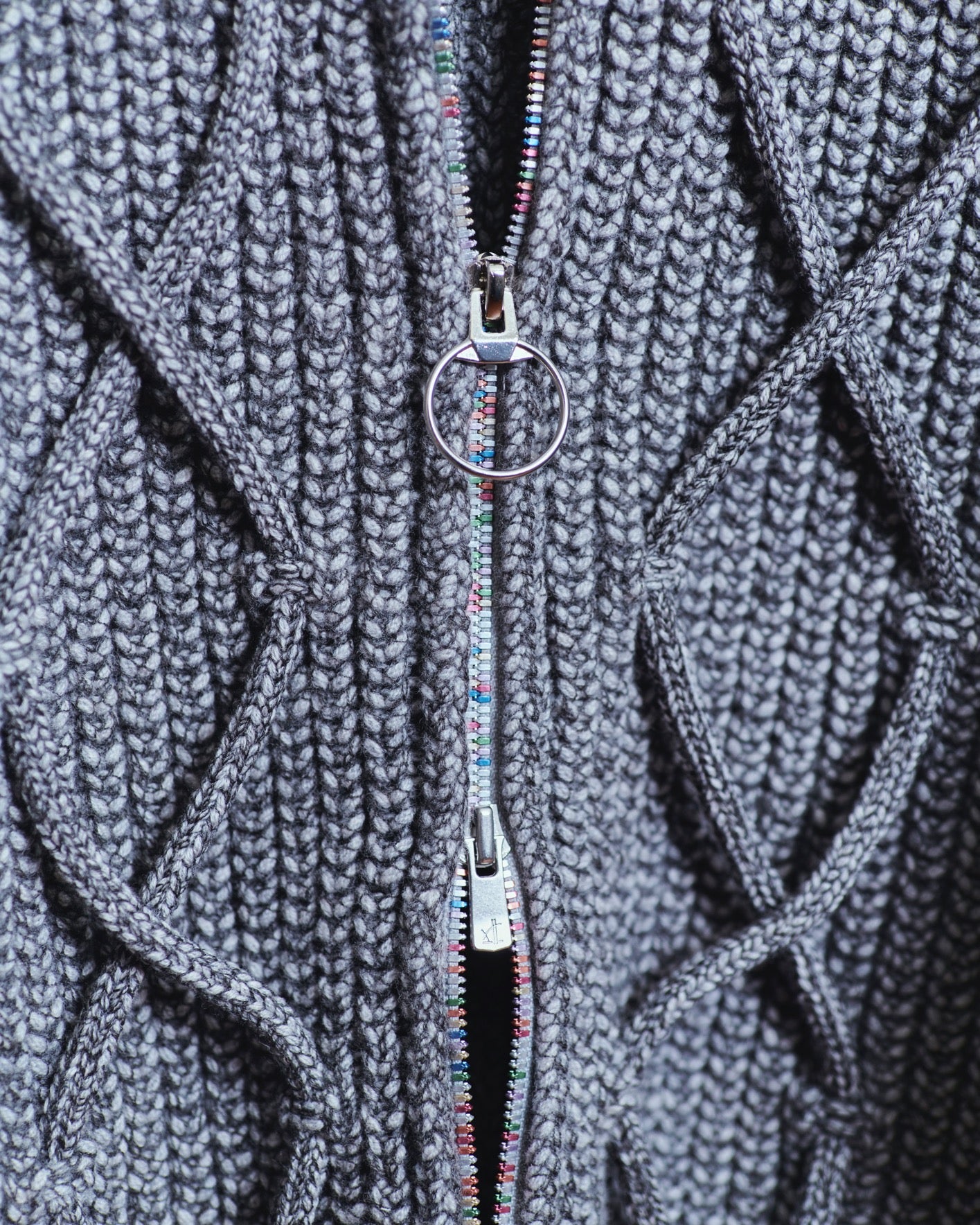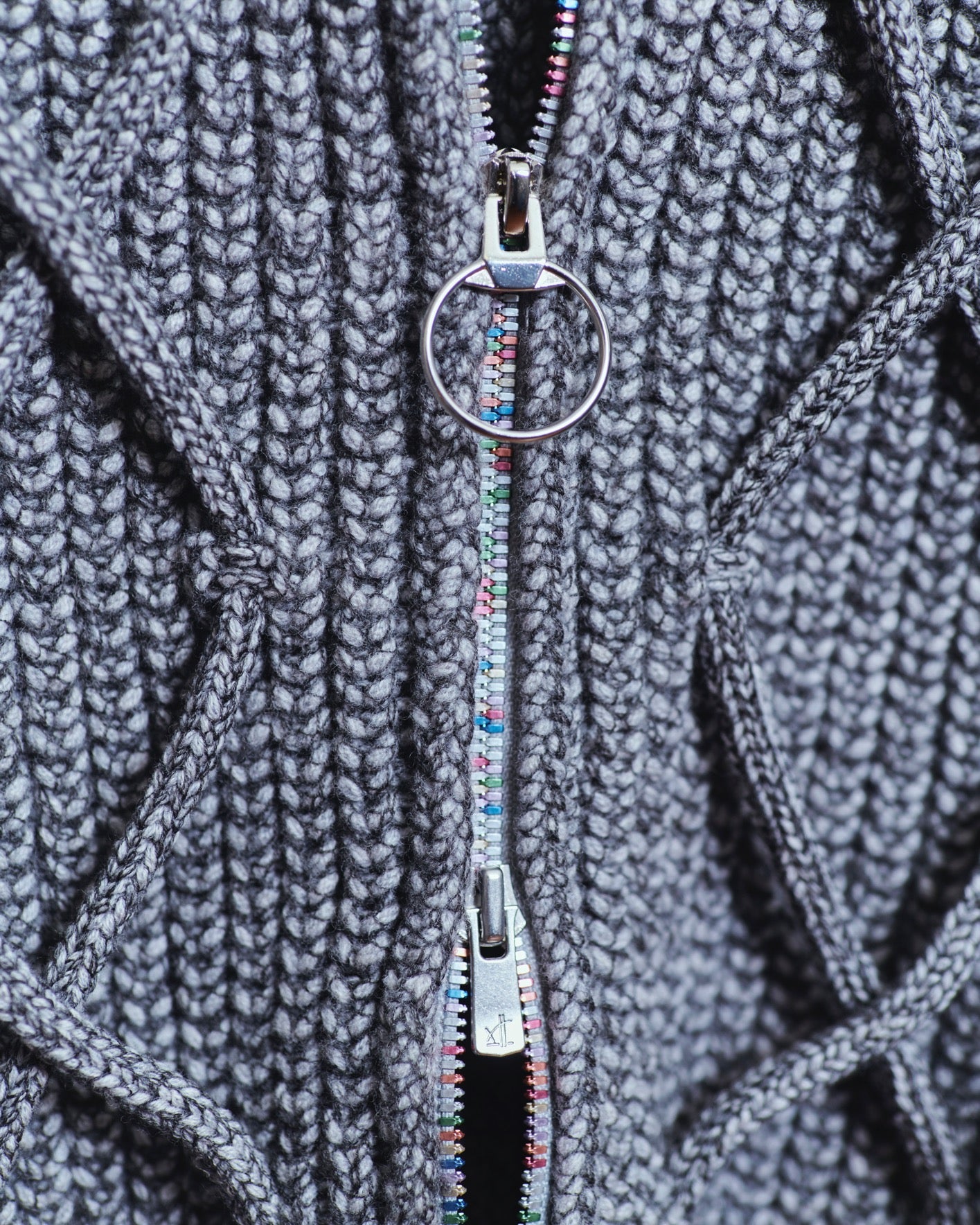 ケーブル柄のデザインが思いつかず、共布でコードを編み、直接ボディに入れ込んで、コード自体でケーブル柄を表現しました。ダブルジップで、GRAYはエレメントがマルチカラーになります。上のスライダーはフープタイプになっており、前後についたコードも揺れてご機嫌なニットです。ウール100%なのでとても暖かいです。