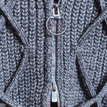 Knit cords swing and sway, making the knit sweater very playful. Double-sided zipper with multi-colored zipper teeth and ring zipper pull.
