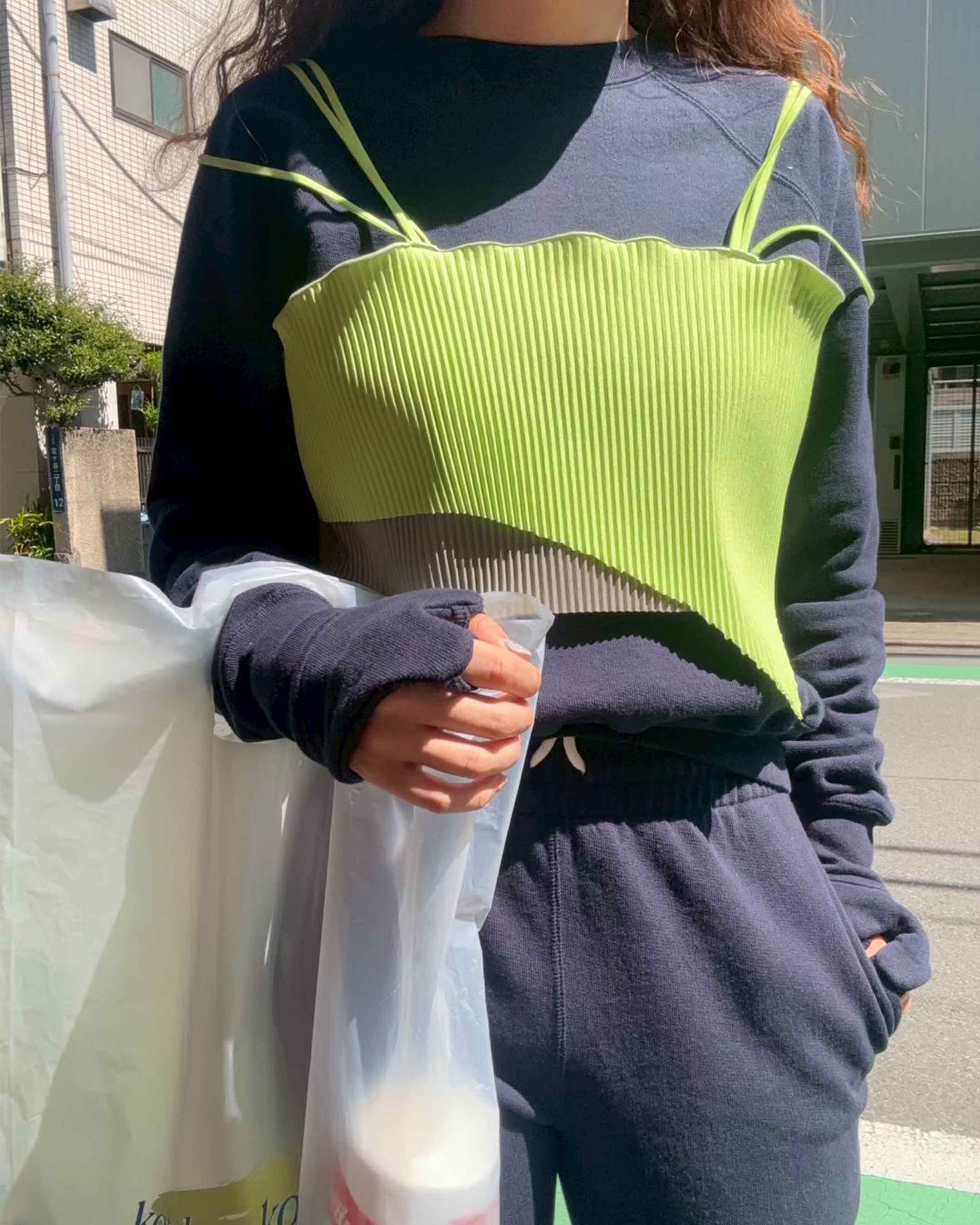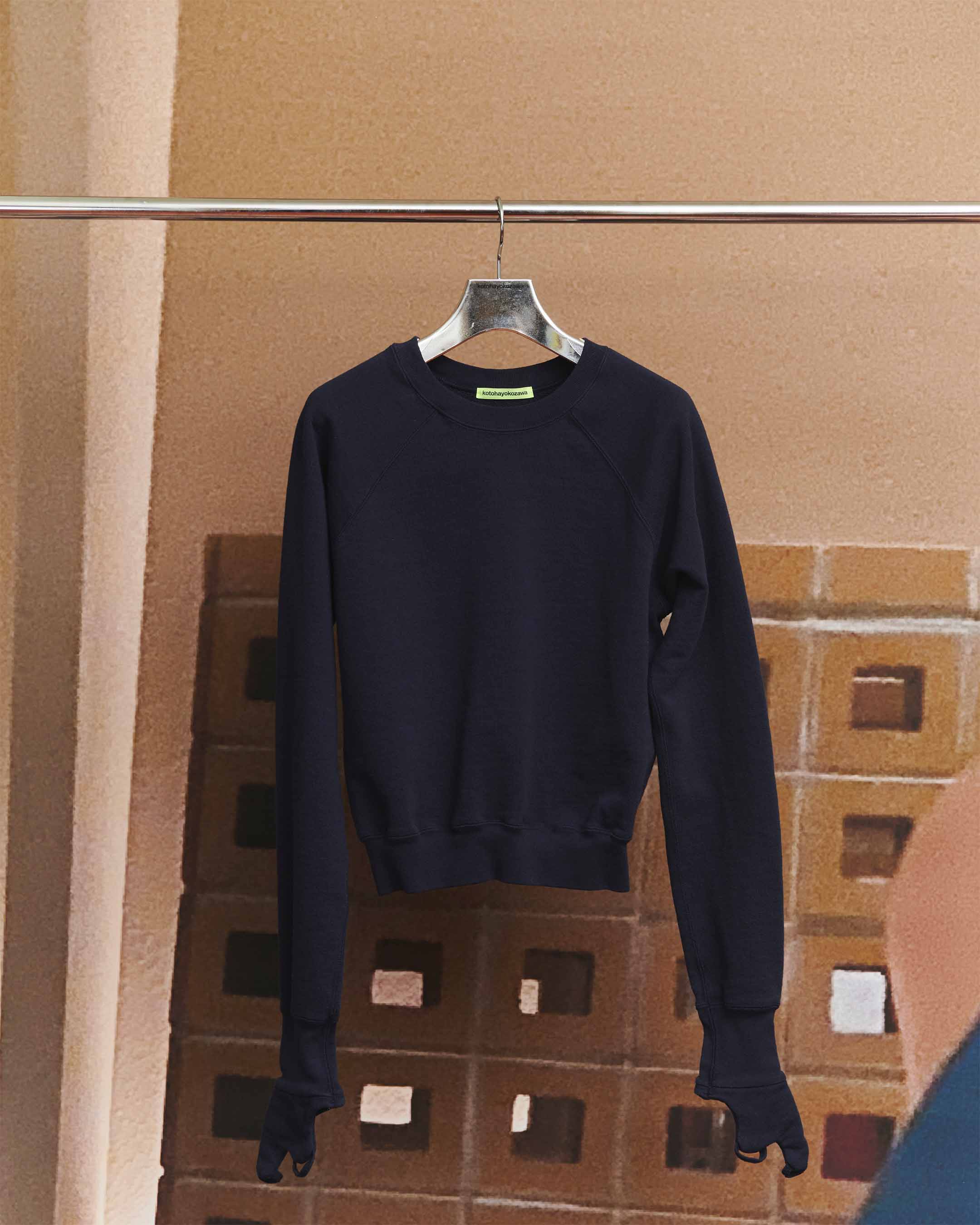 クロップド丈と今シーズンを象徴する“CUFF-GLOVE”ディテールがポイントのスウェットトップス。AD02と合わせてフーディー風にも。