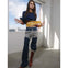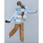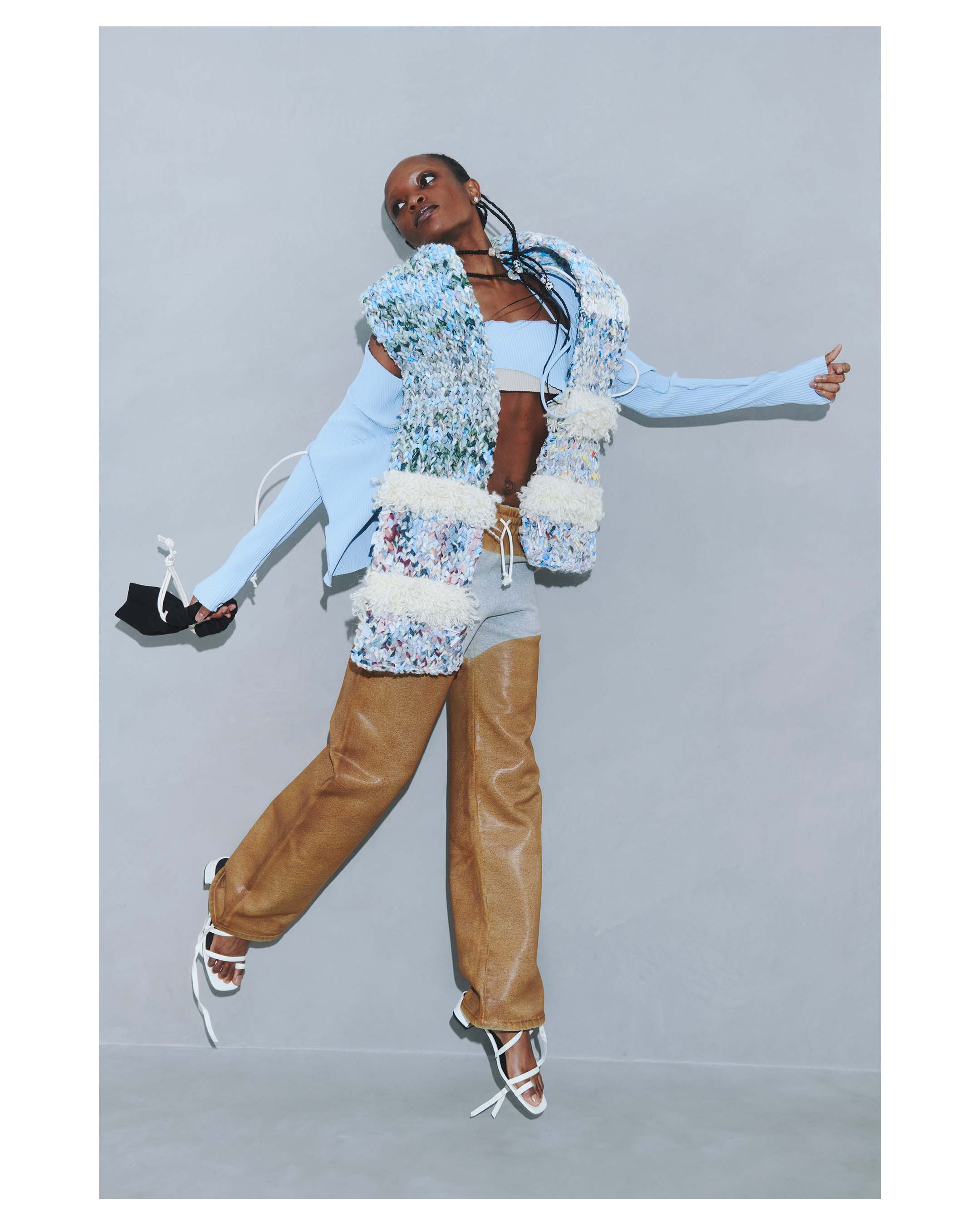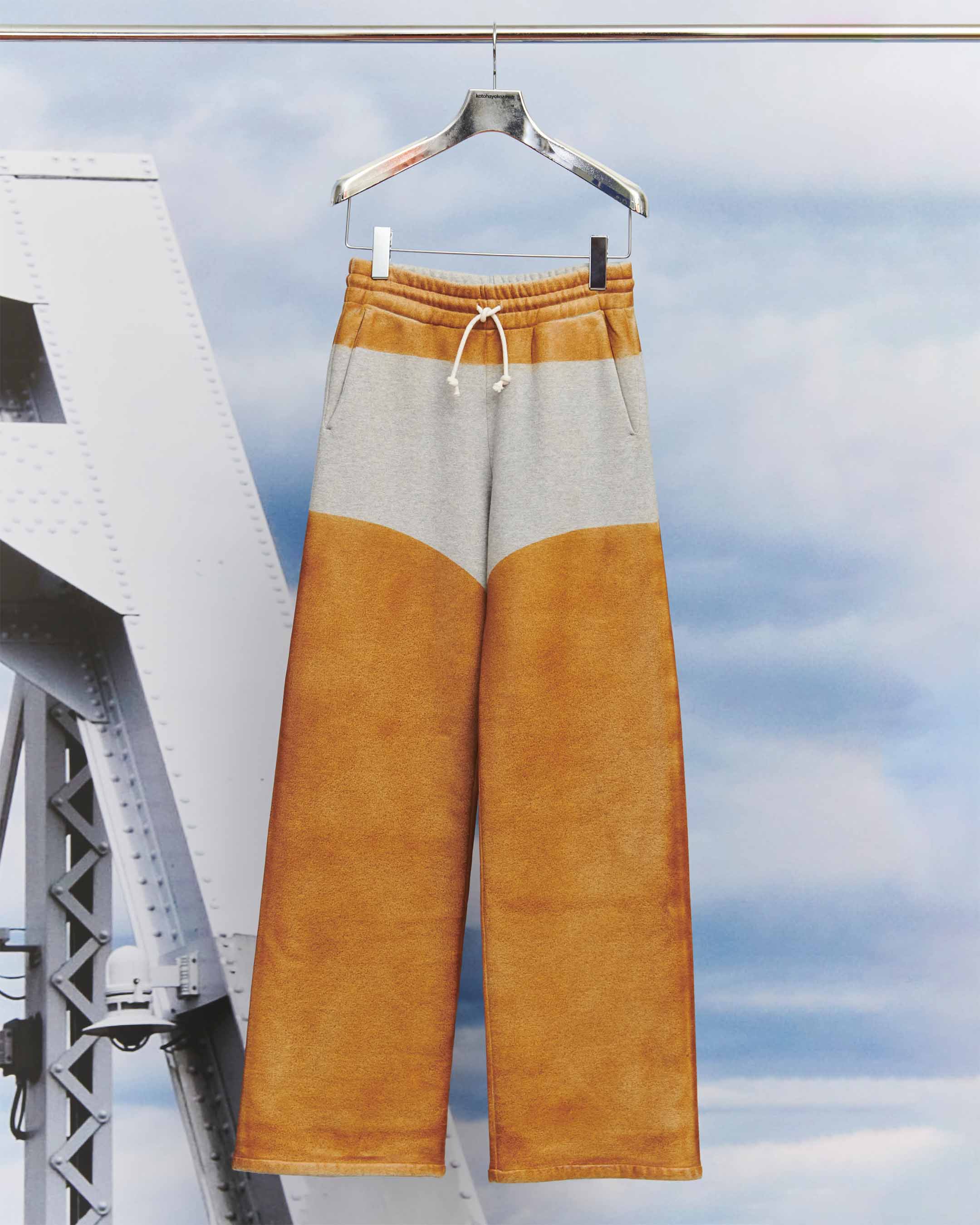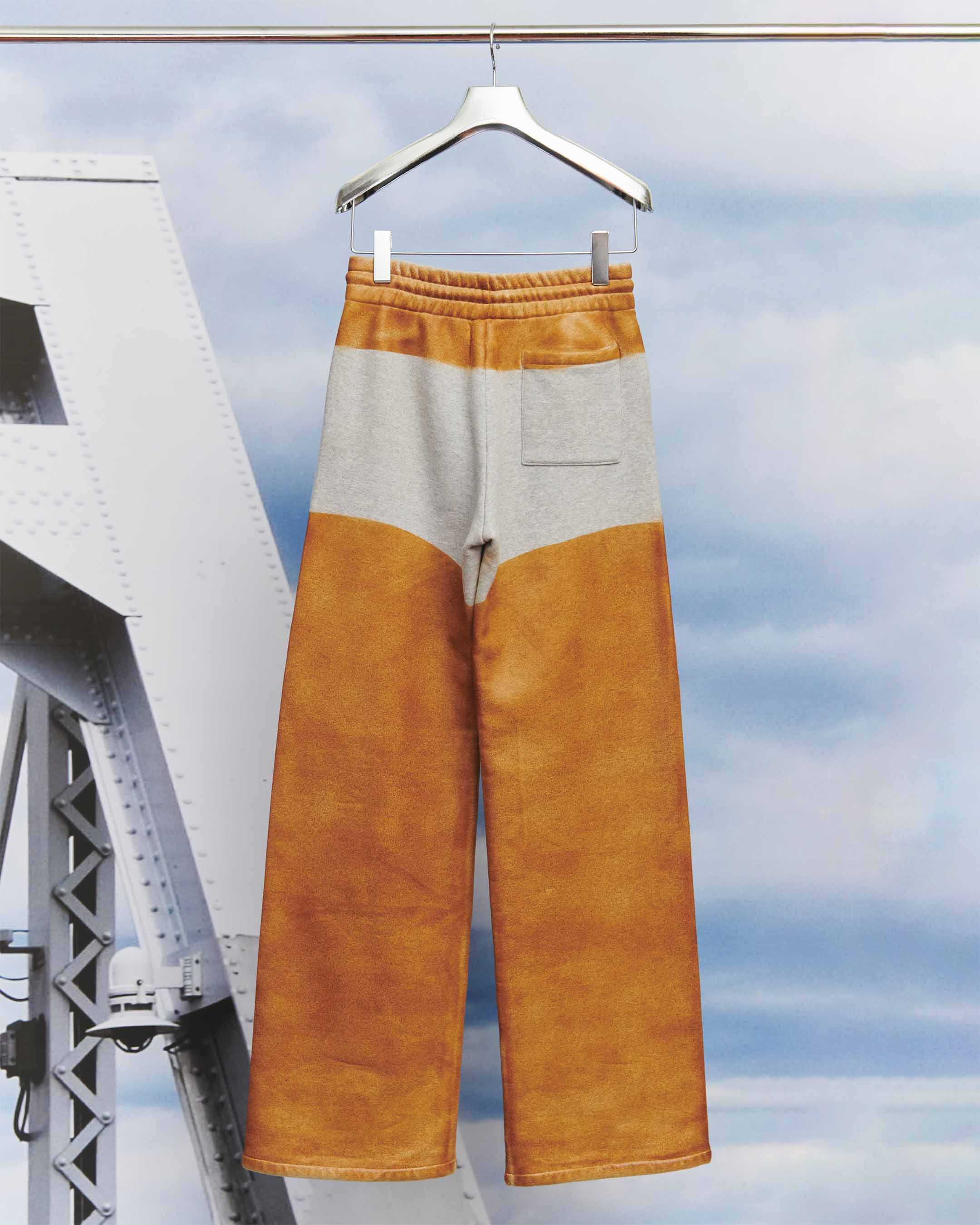 厚手の杢グレー裏起毛にレザーのような質感のペイントを施したシリーズ。ワイドシルエットのパンツは裾をロールアップして起毛部分を出し、ムートン風の見せ方も楽しめます。KTX5A-CS01とセットアップでの着用も可能です。