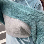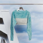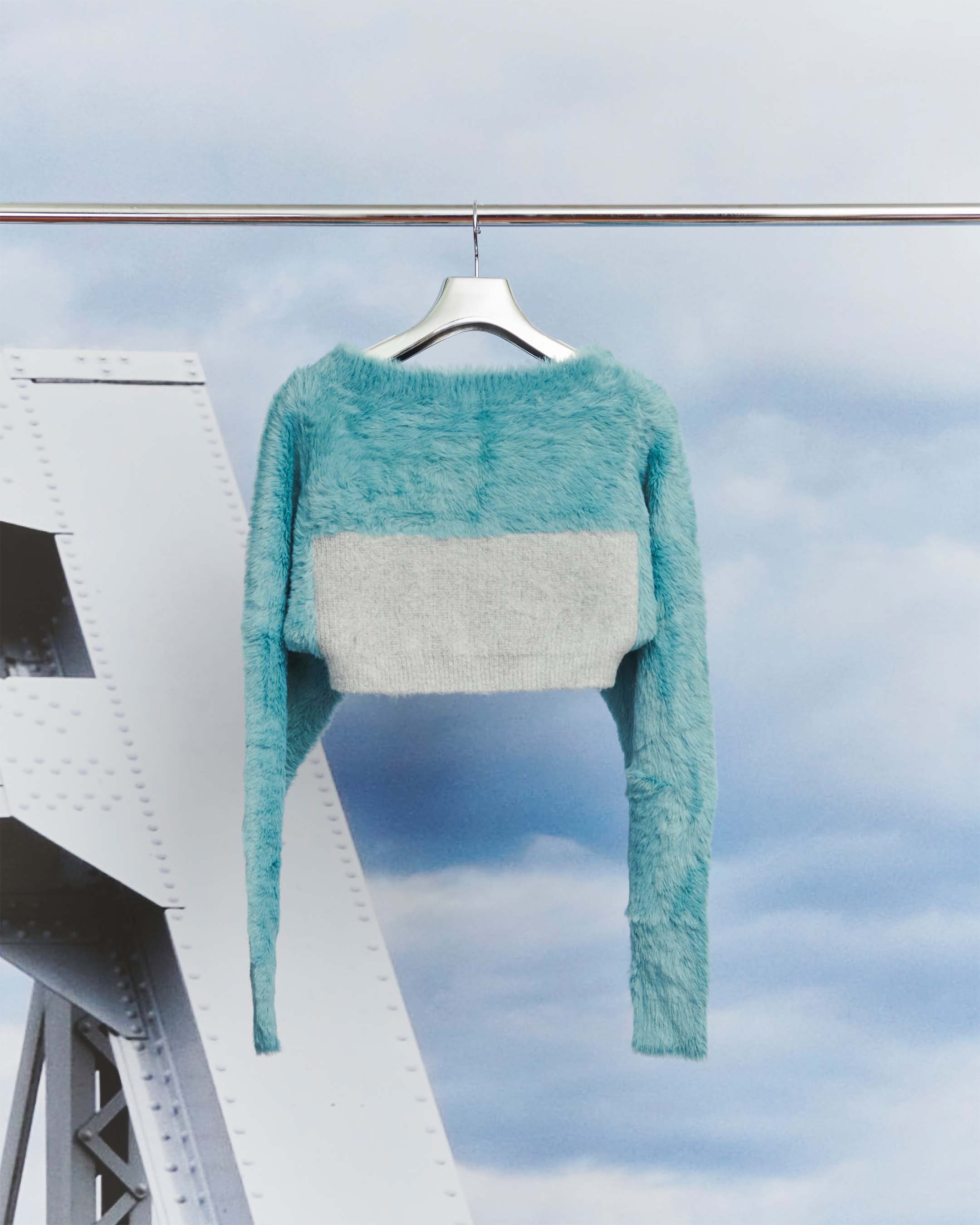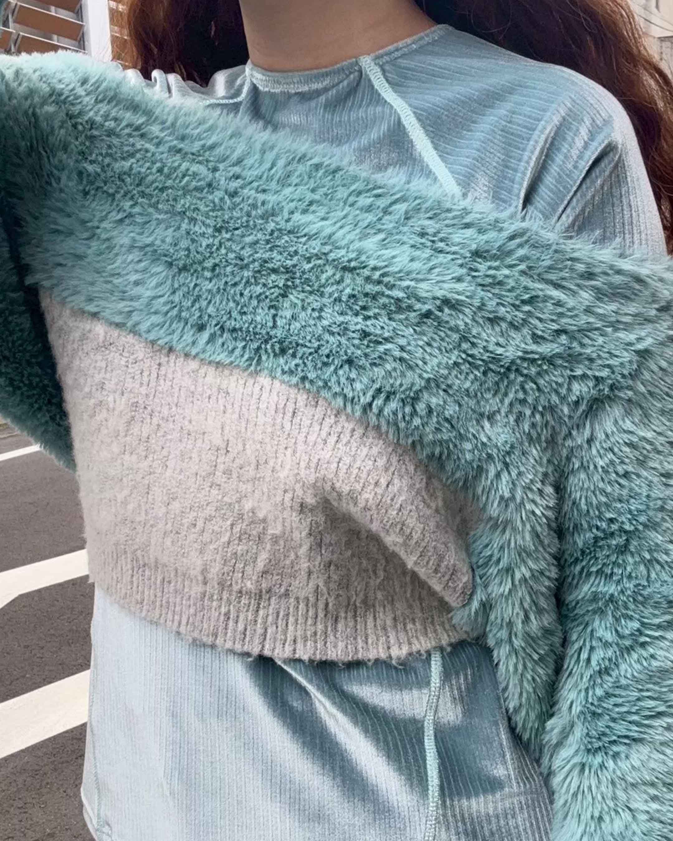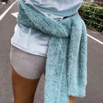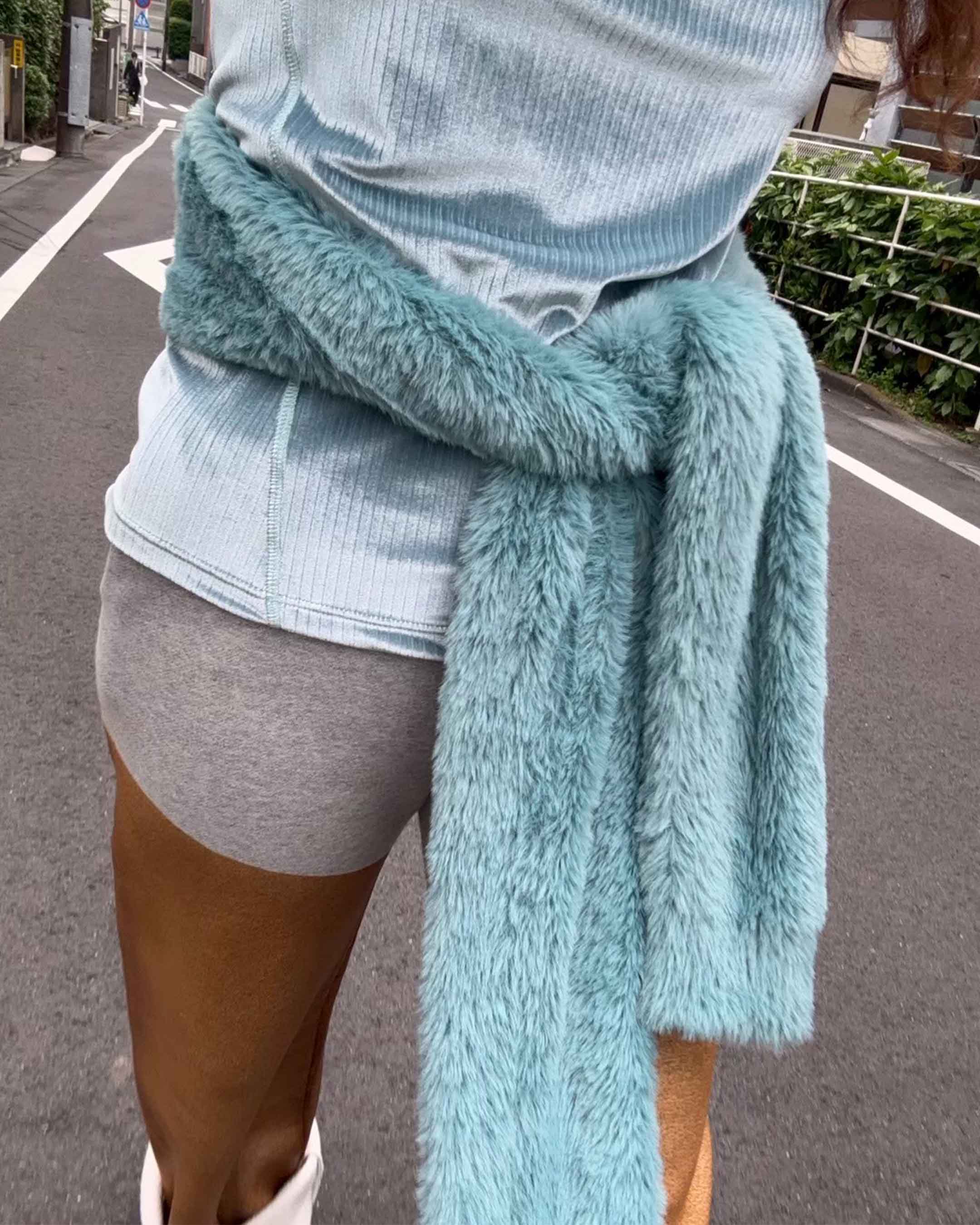 トップスやマフラー、腰巻きとして、また上下逆さでも着用可能なマルチウェイアイテム。長めの毛足とモヘア風の編み地は思わず撫でたくなる肌触り。