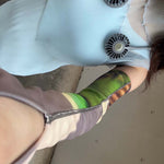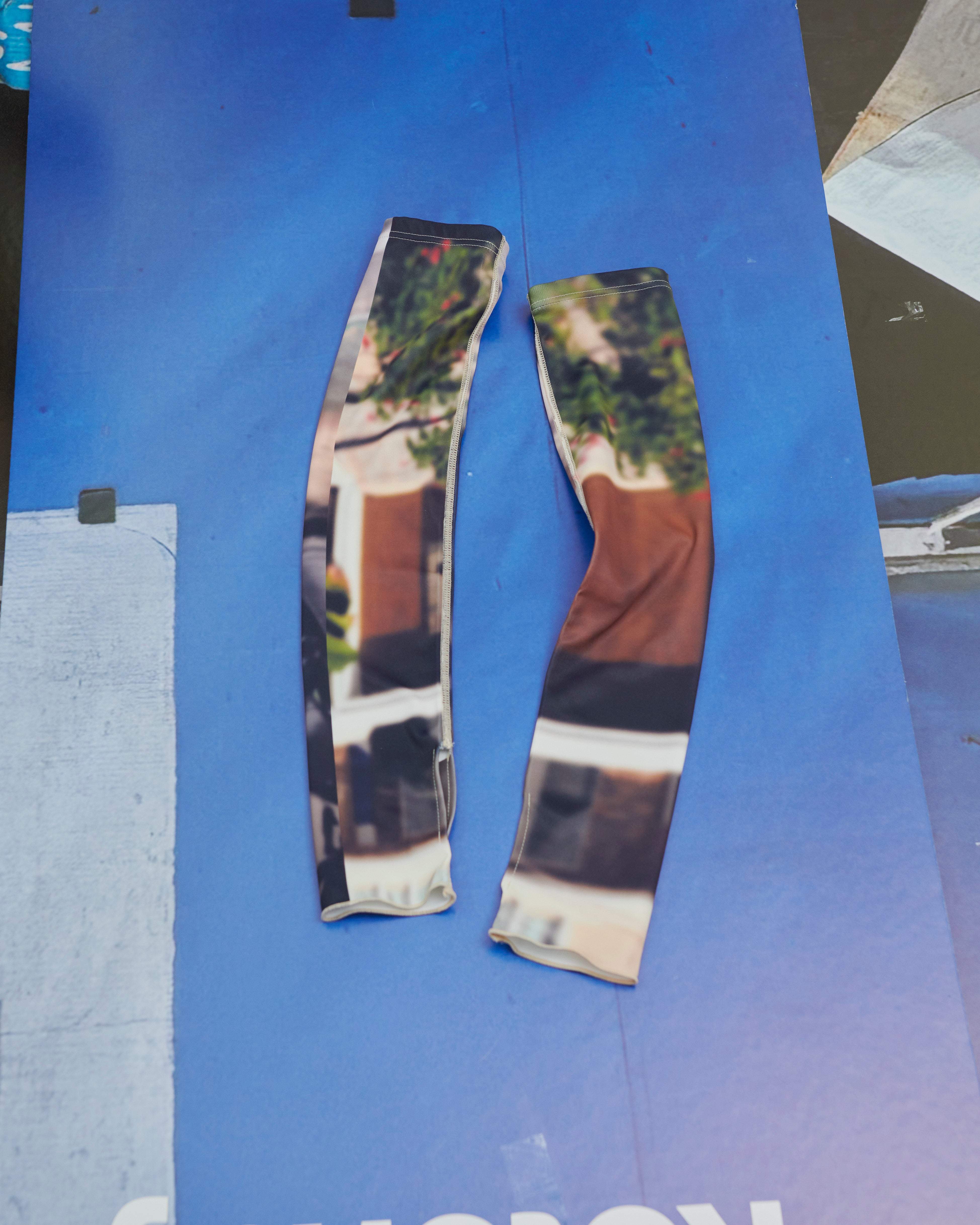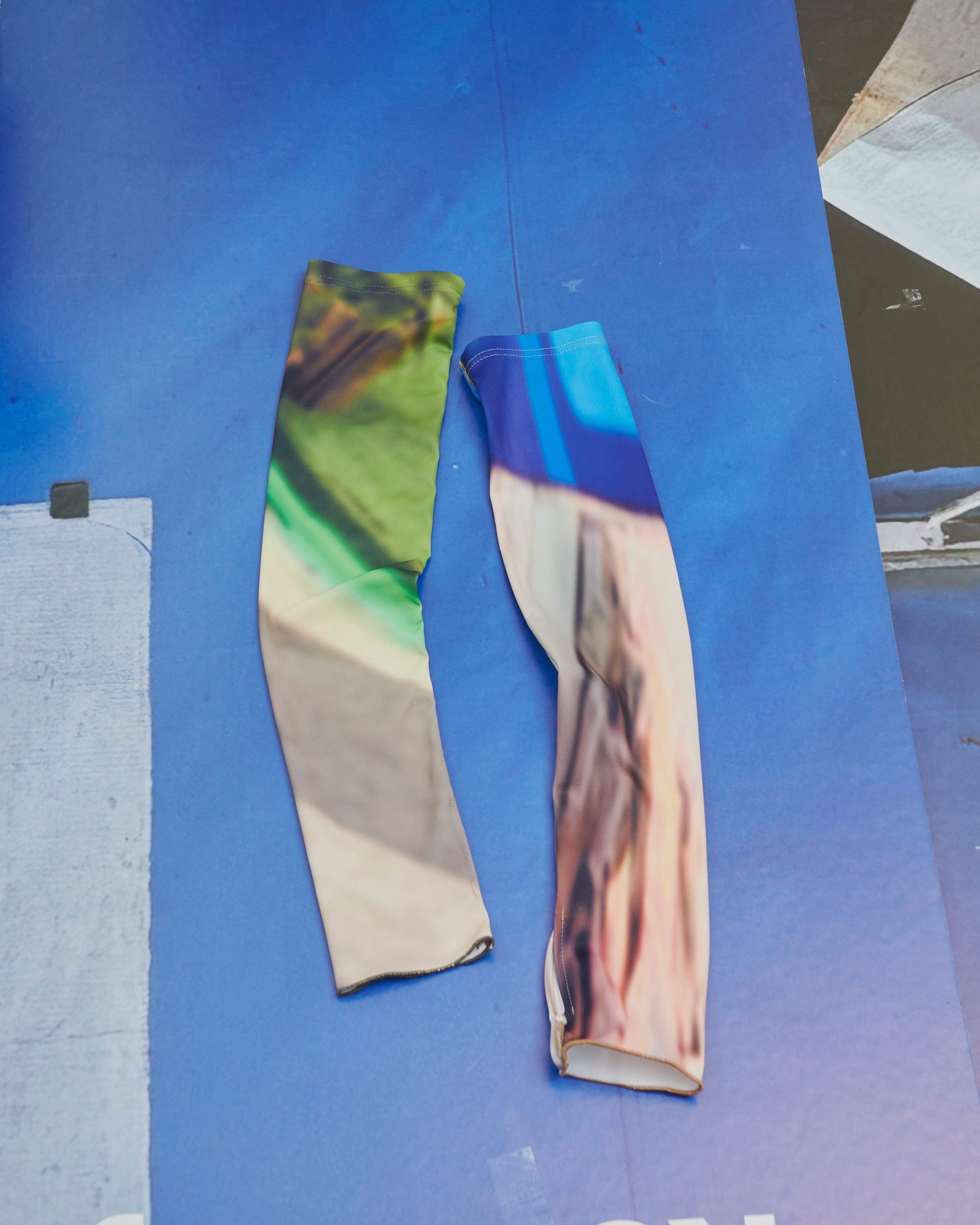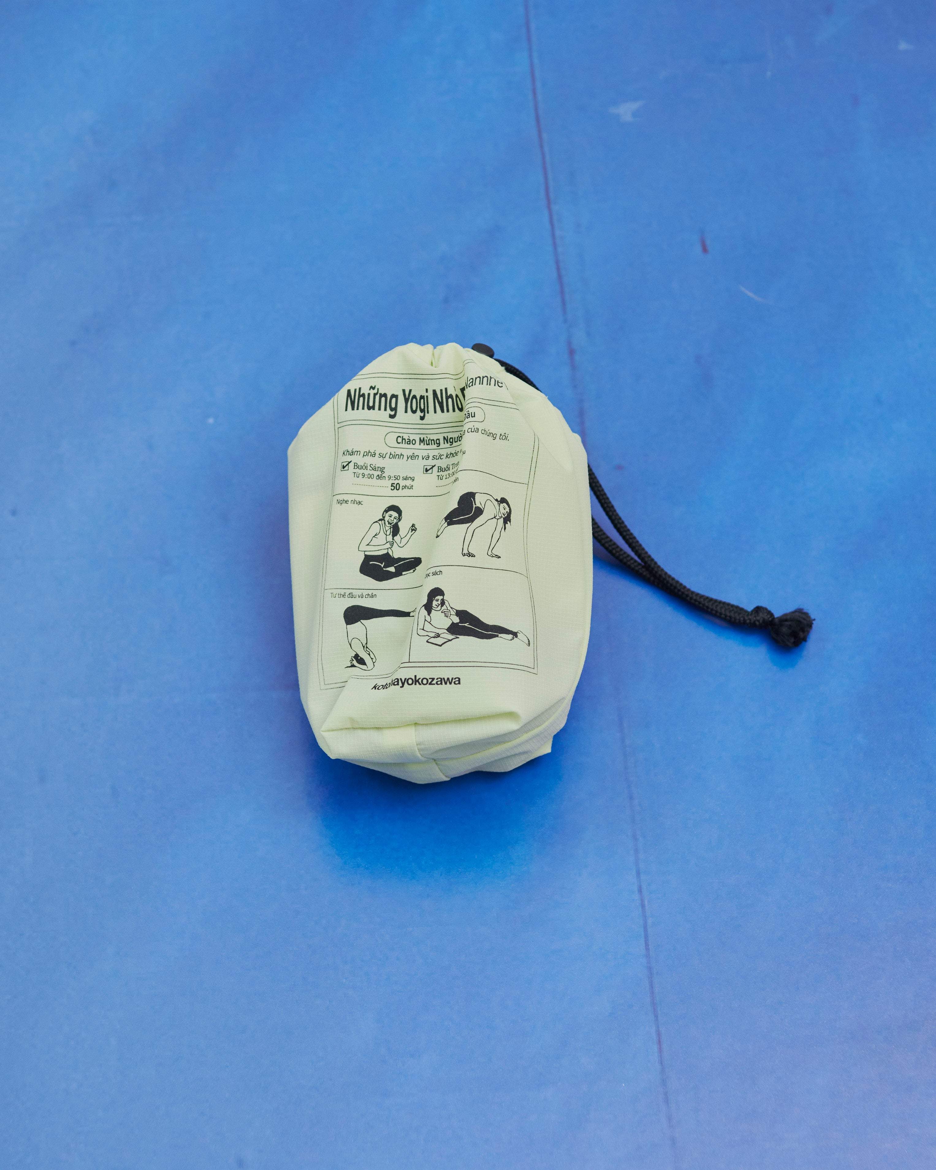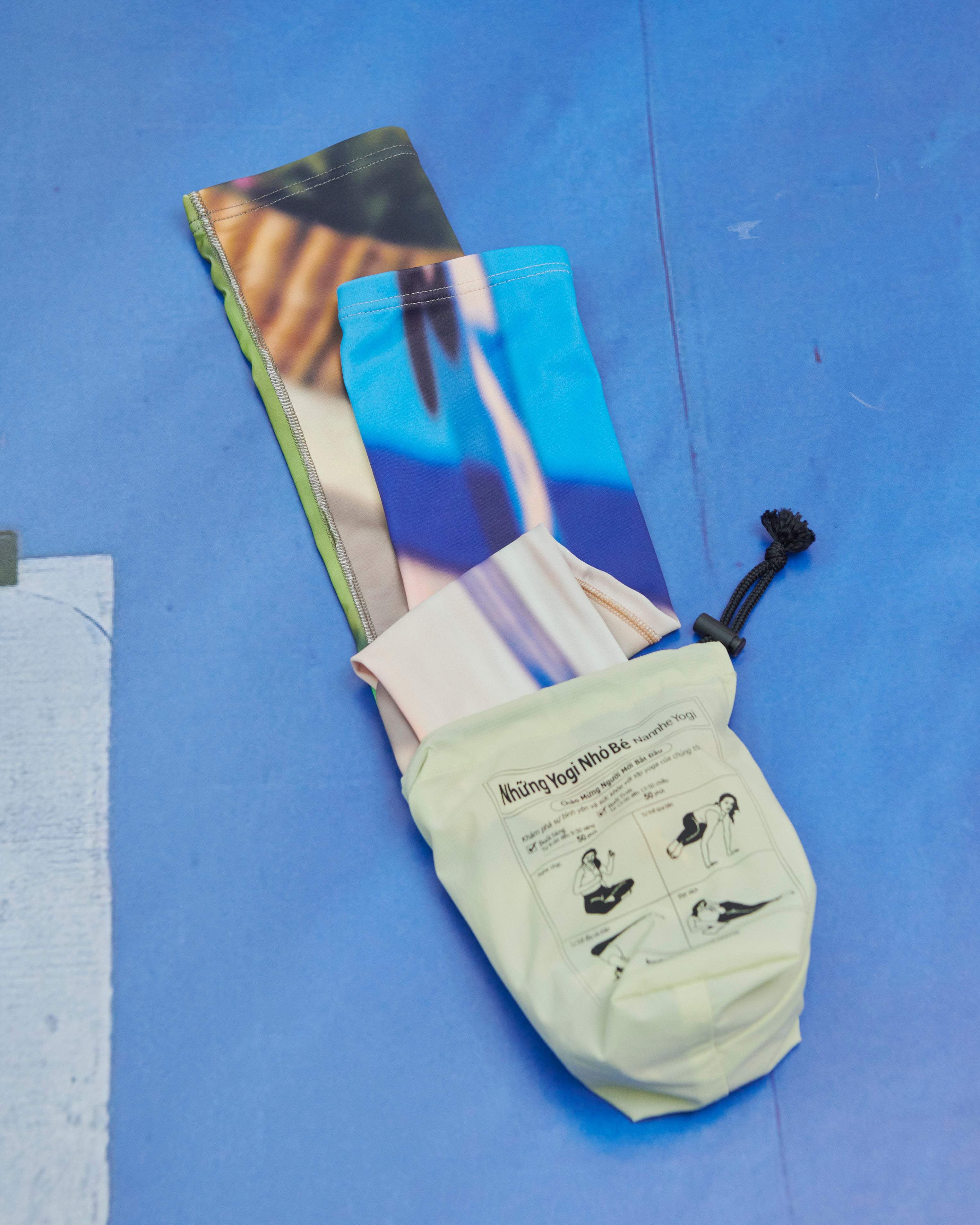 スタイリングのアクセントとしてでなく、日焼け対策や防寒具として使用できるグラフィカルなアームカバー。ヨガ教室のノベルティのようなオリジナルパッカブルポーチ付き。