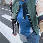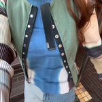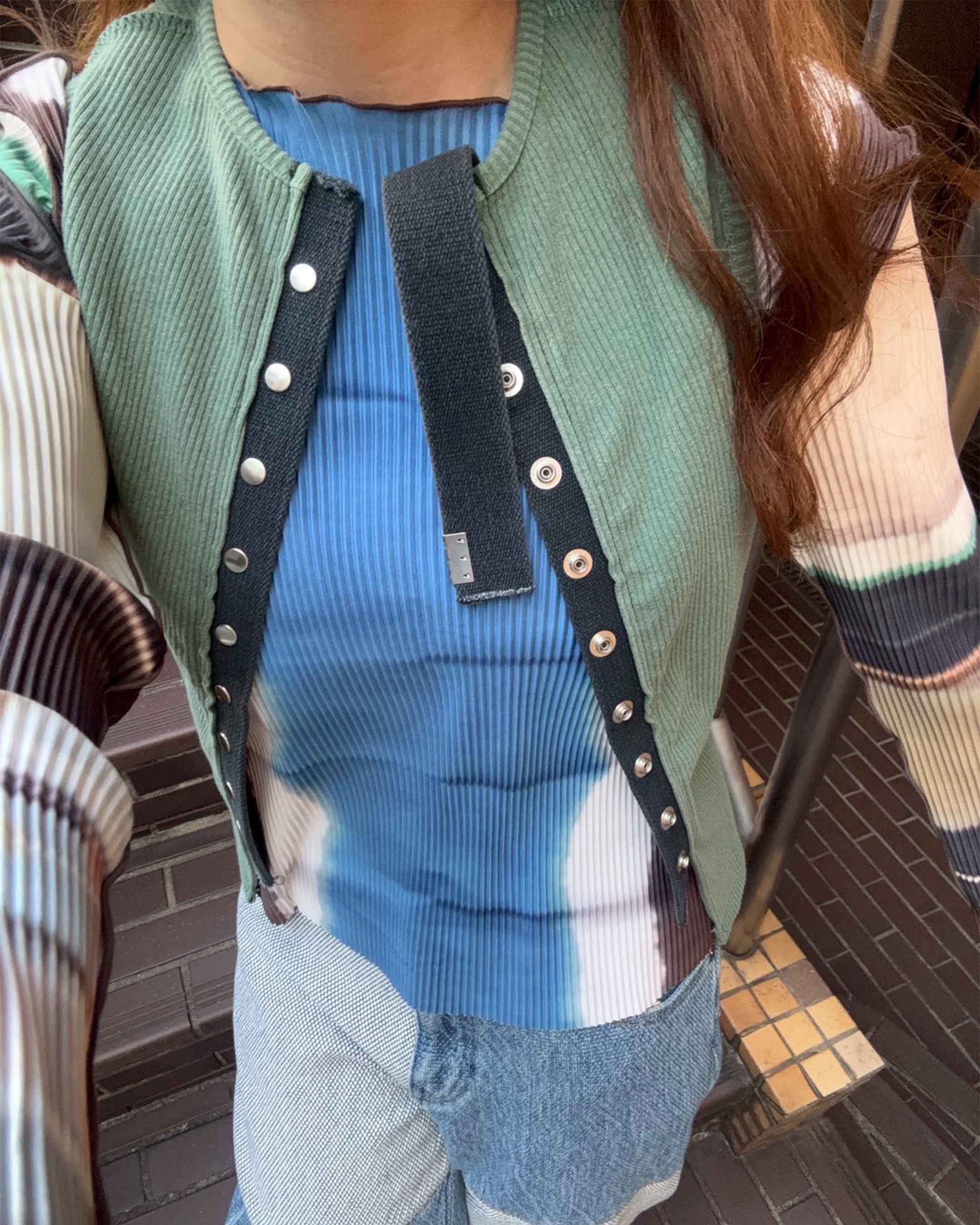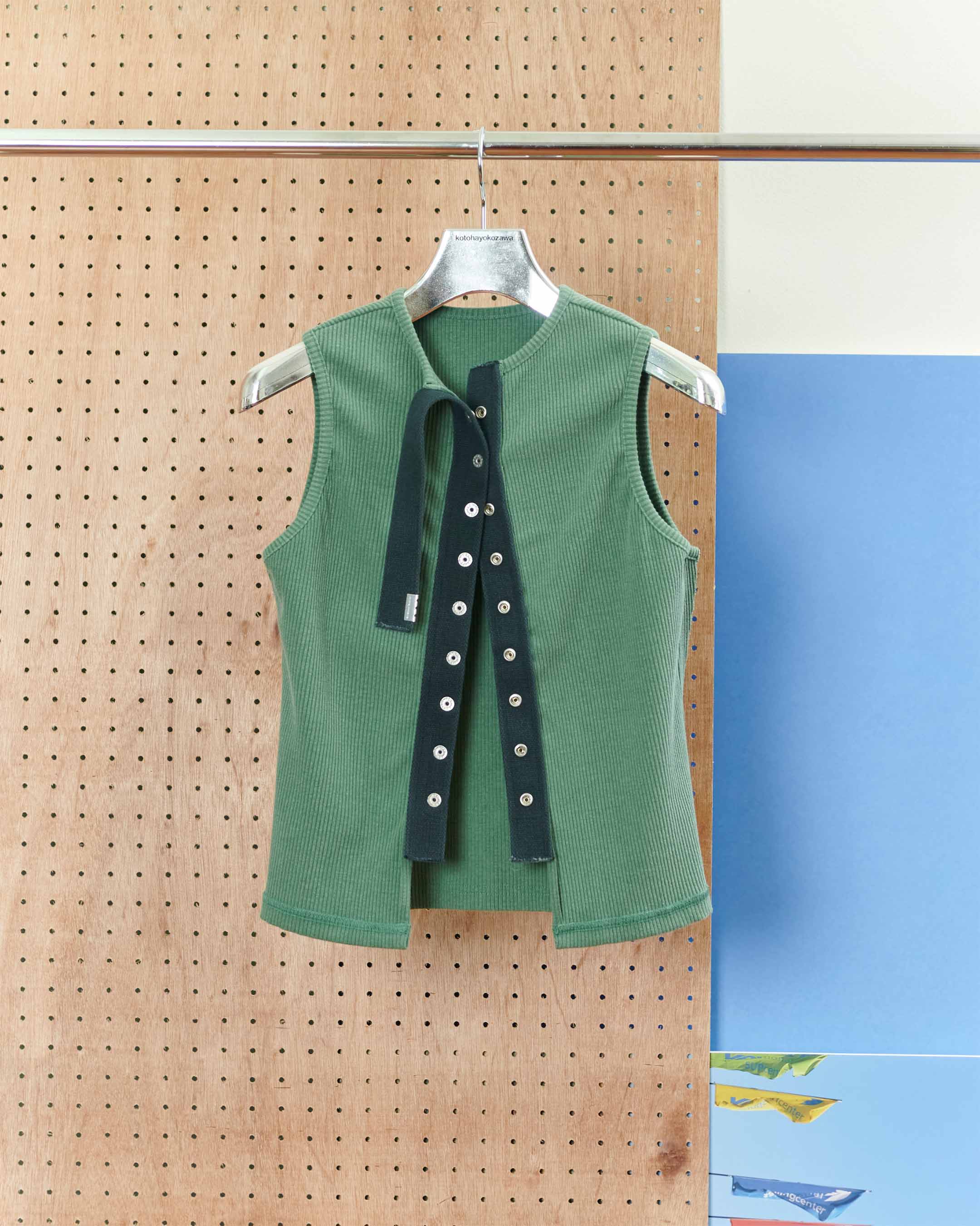 顔料インクでヴィンテージ加工を施したリブ地に、ストーンウォッシュ加工のヘビーウェイト綿テープをアクセントとして使用。本体の生地とテープの質感が絶妙にマッチし、テープ先にはオリジナルのメタルクリップを取り付けています。タンクトップは一番上のスナップだけを留めて、インナーを覗かせる着こなしがおすすめです。