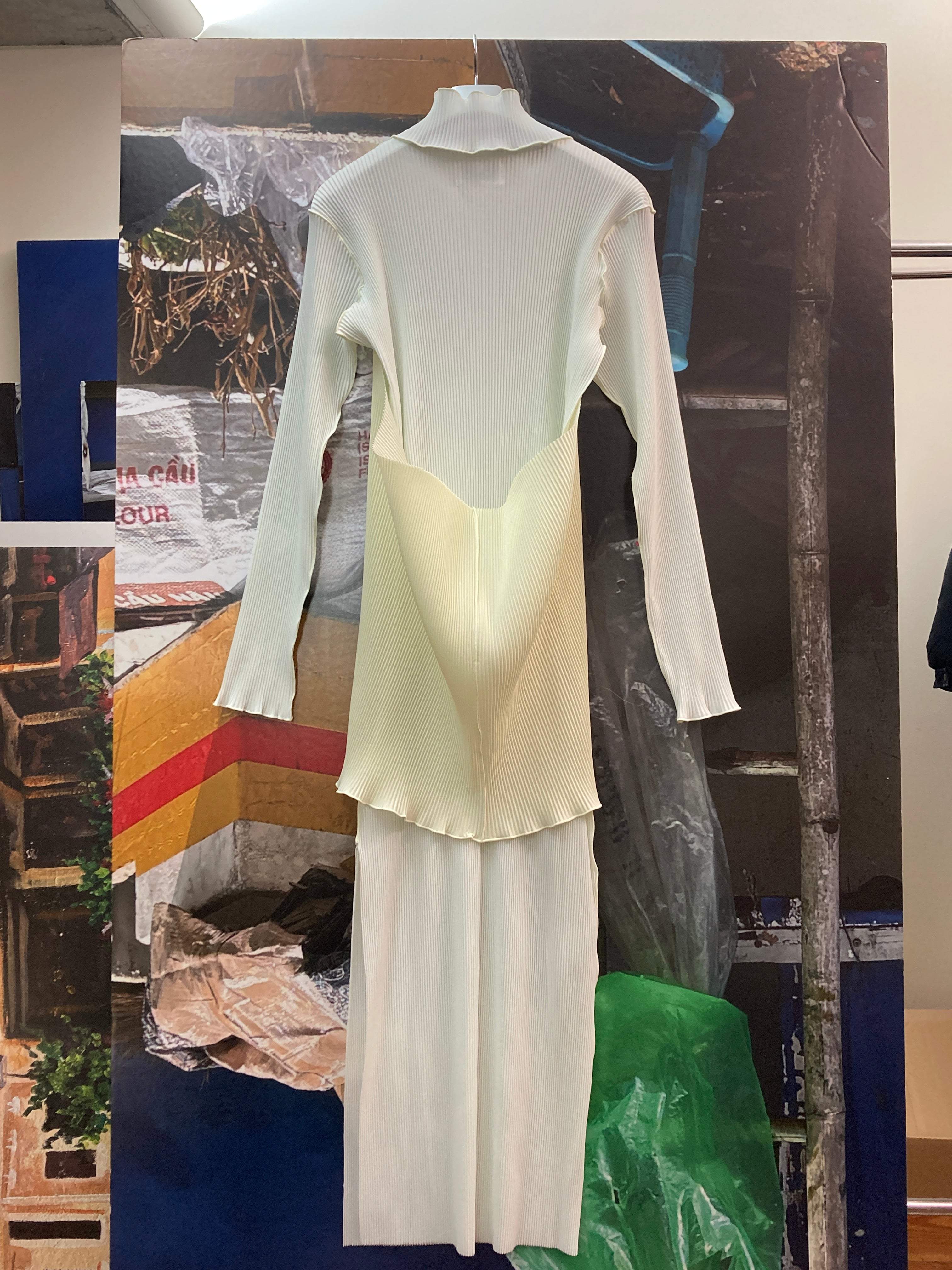 Dense and sheeny pleated polyester fabric, comfortable for any body shape. Wrinkle-resistant and quick-dry recycled polyester made from collected plastic bottles.