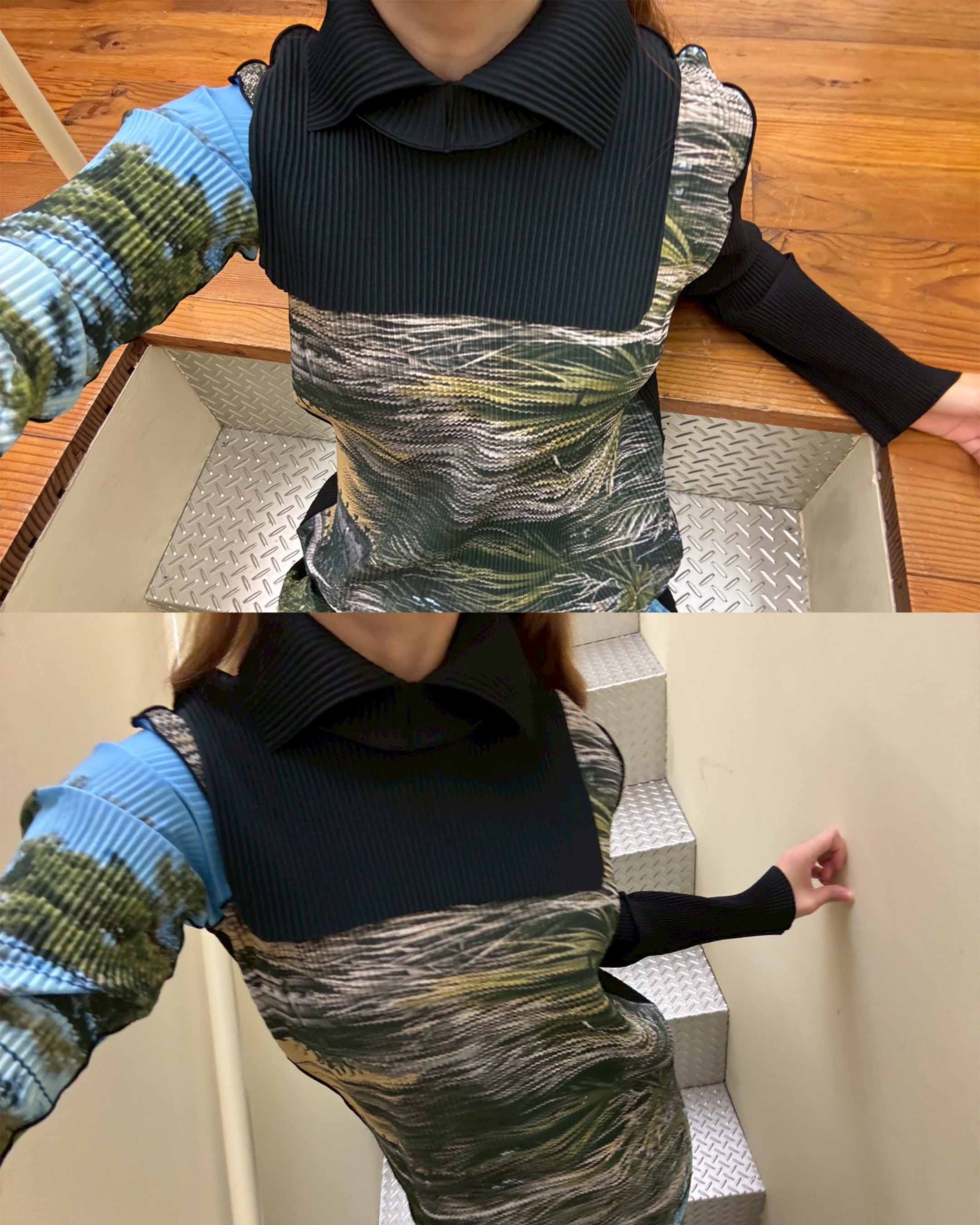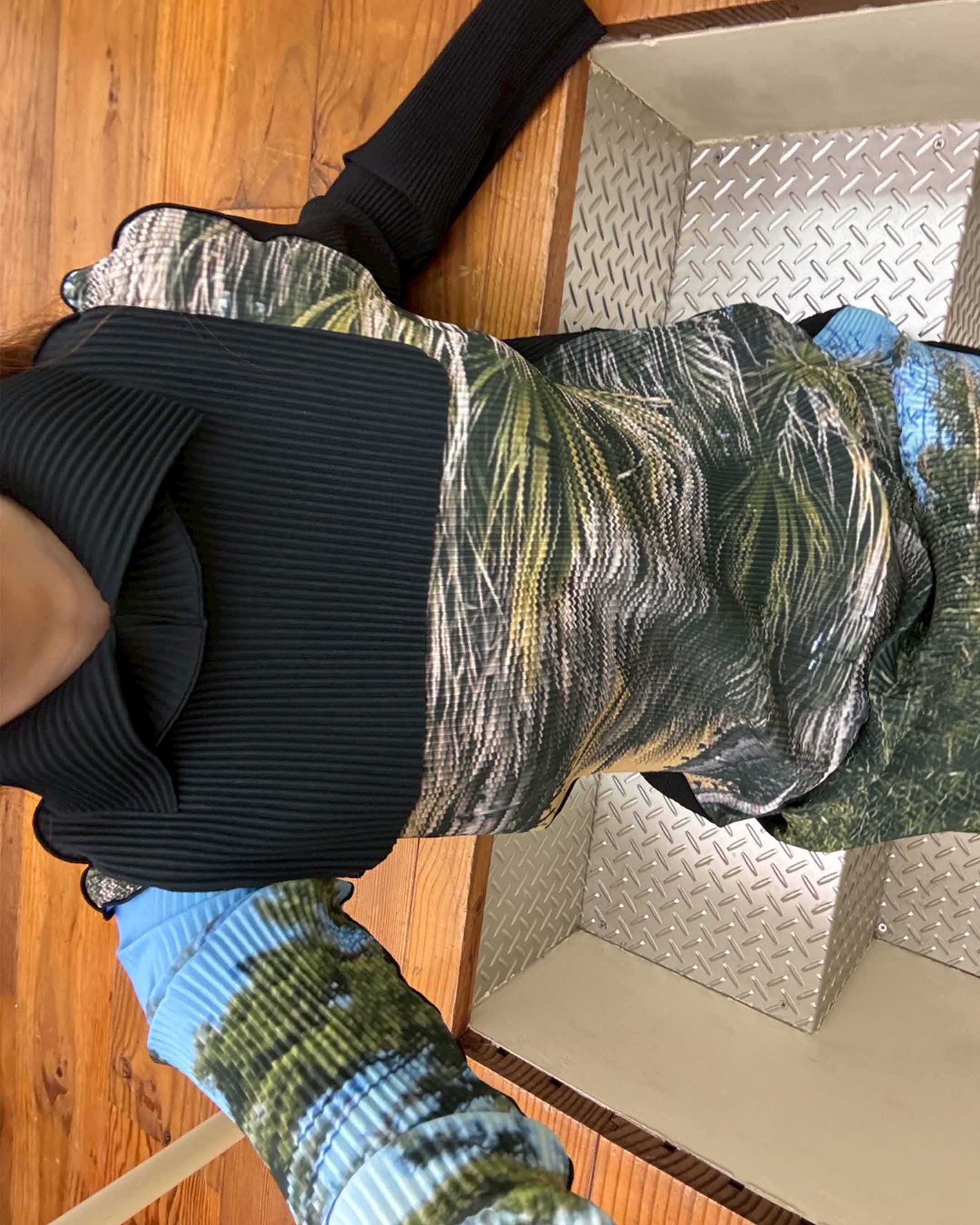 Made from recycled polyester sourced from collected plastic bottles. Pleated dense polyester, comfortable for any body shape. Wrinkle-resistant and quick-drying, perfect for travel and everyday wear.