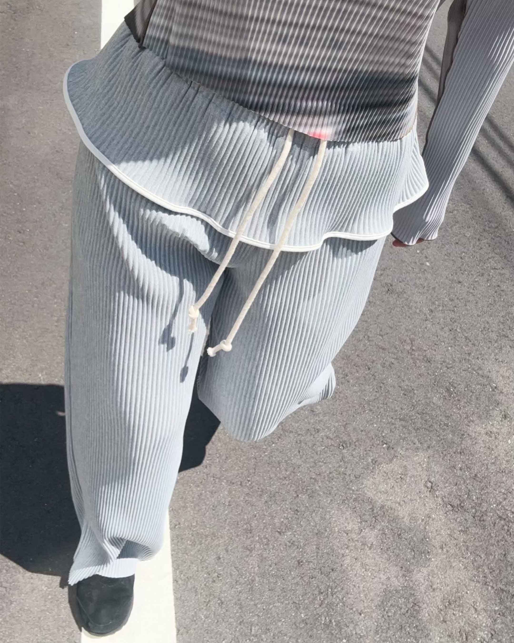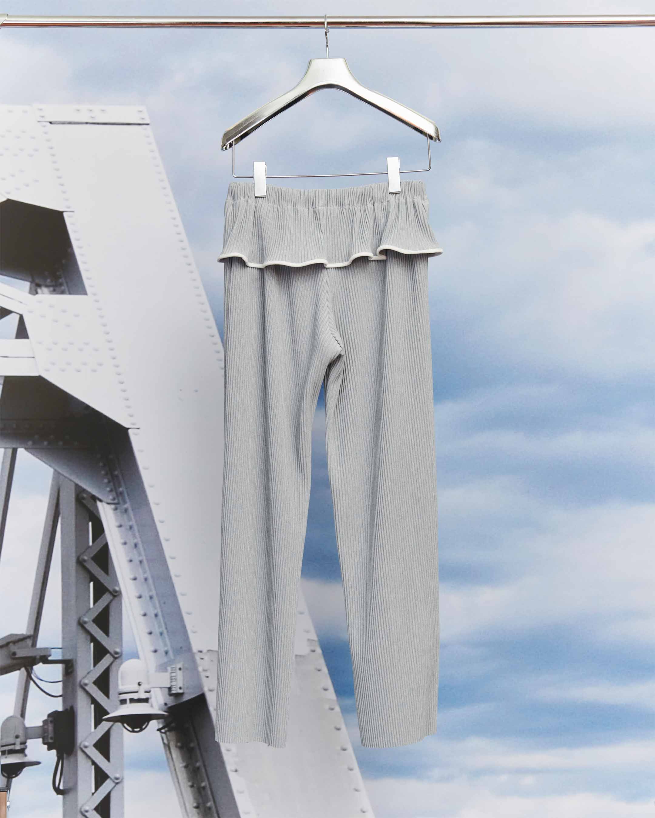 Layered pants from the〈CRISP〉series, new this season, featuring a cotton-like texture and structured silhouette.