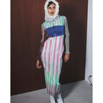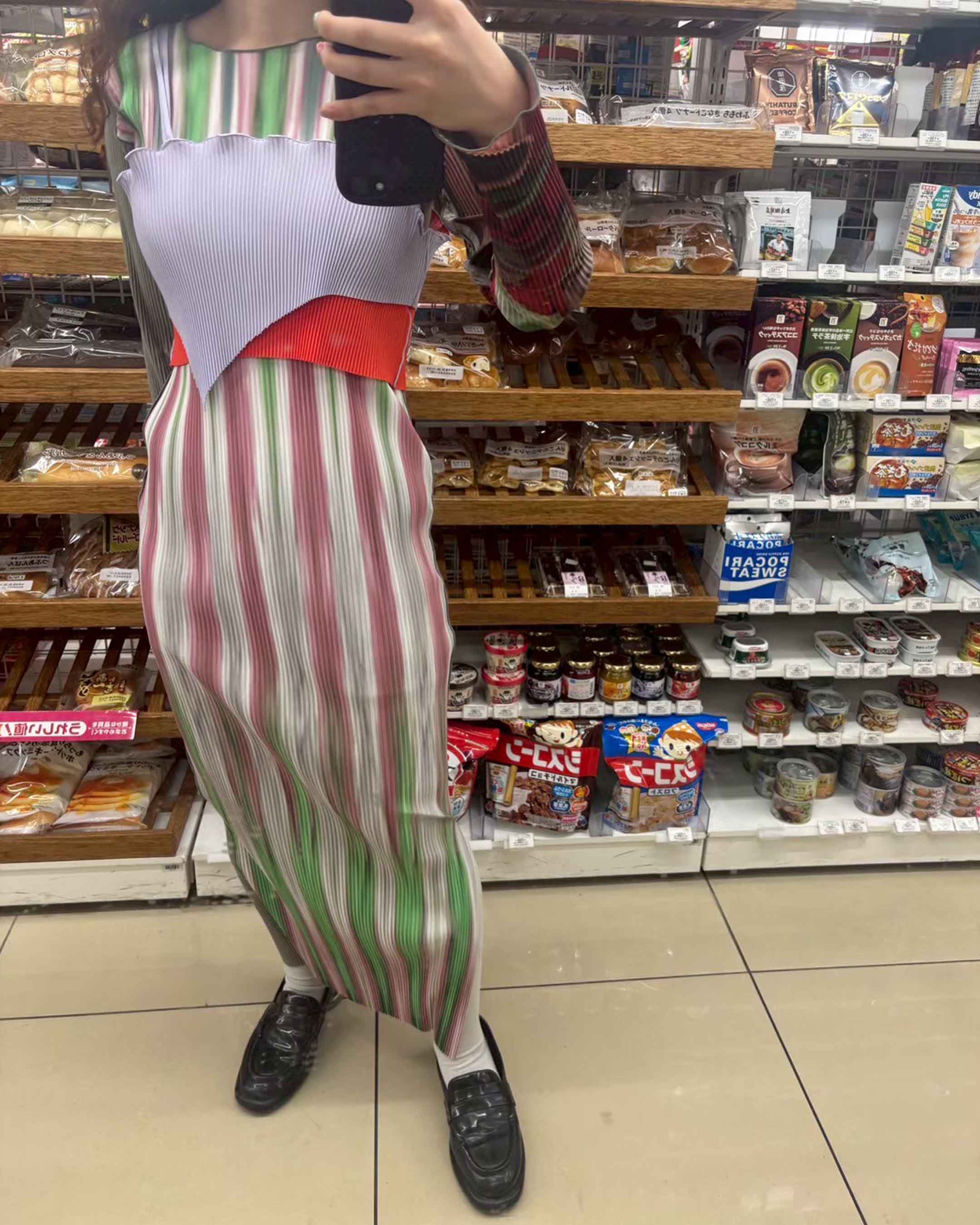 Made from recycled polyester sourced from collected plastic bottles. Dense and sheeny pleated polyester, comfortable for any body shape. Wrinkle-resistant and quick-drying, perfect for travel and everyday wear.