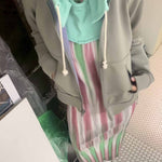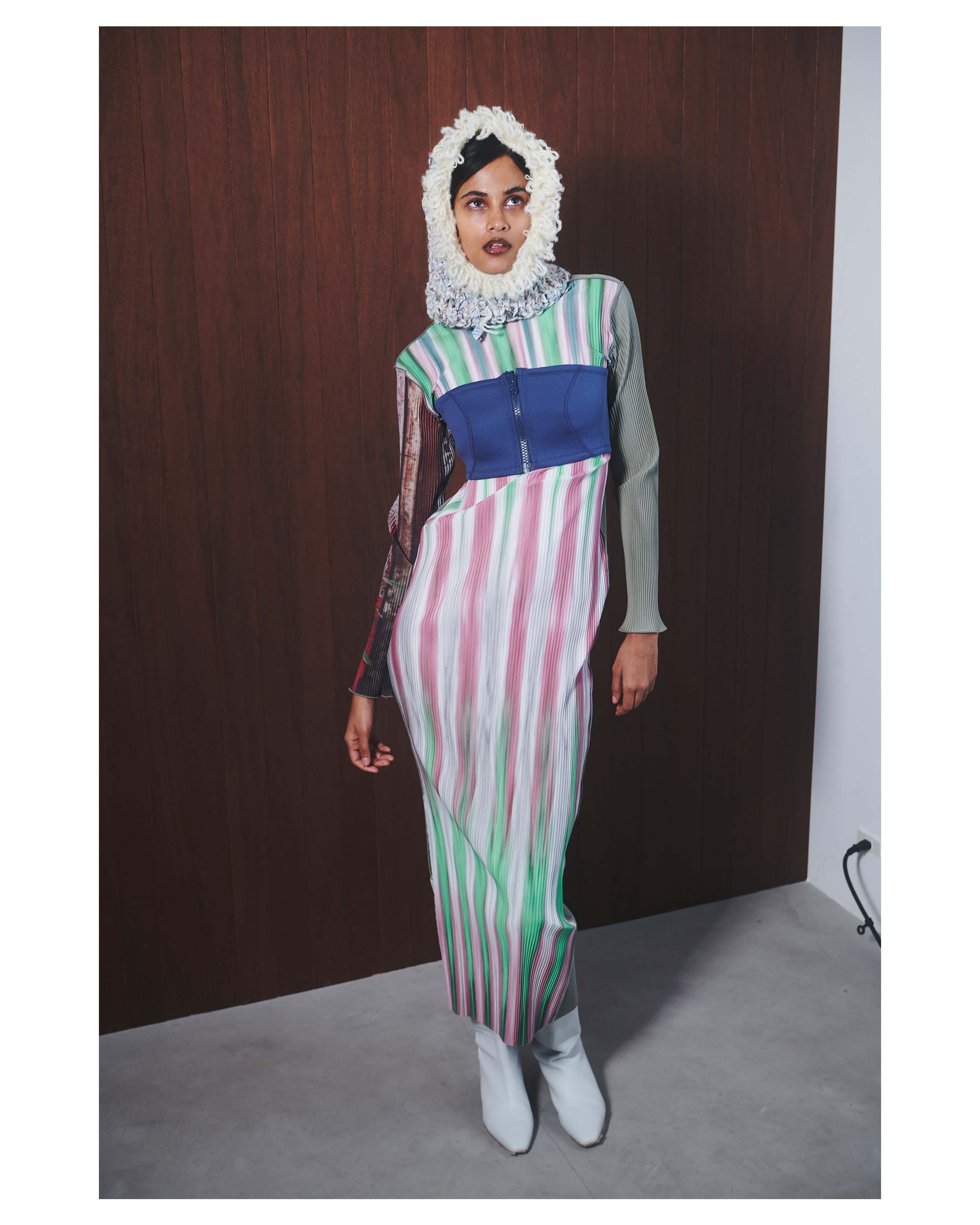 Featuring a fresh twist, this season's graphic incorporated orizome (fold-dyeing) a team tried at the studio. The result is a graphic with a playful and unexpected mood. Slit on right hem.
