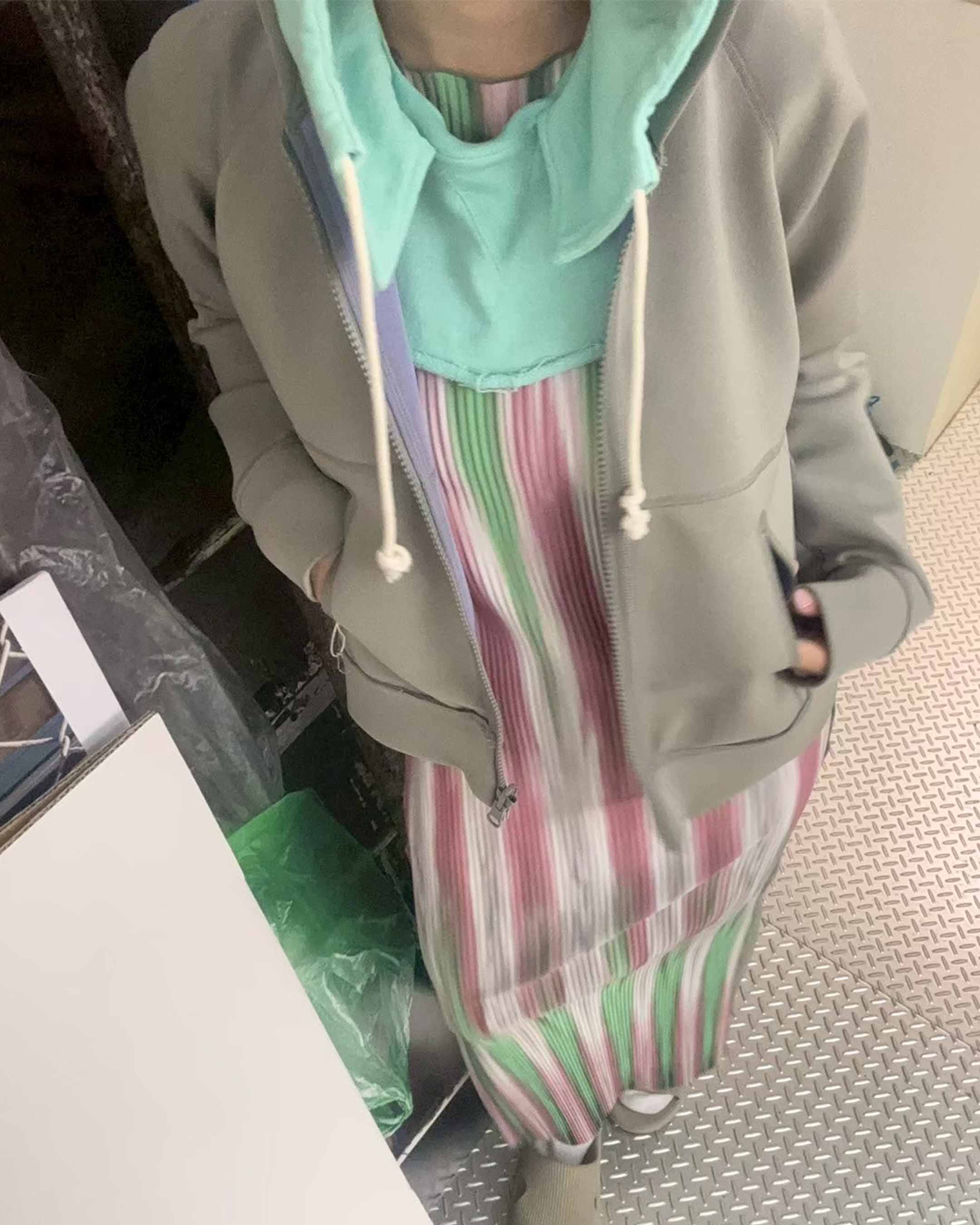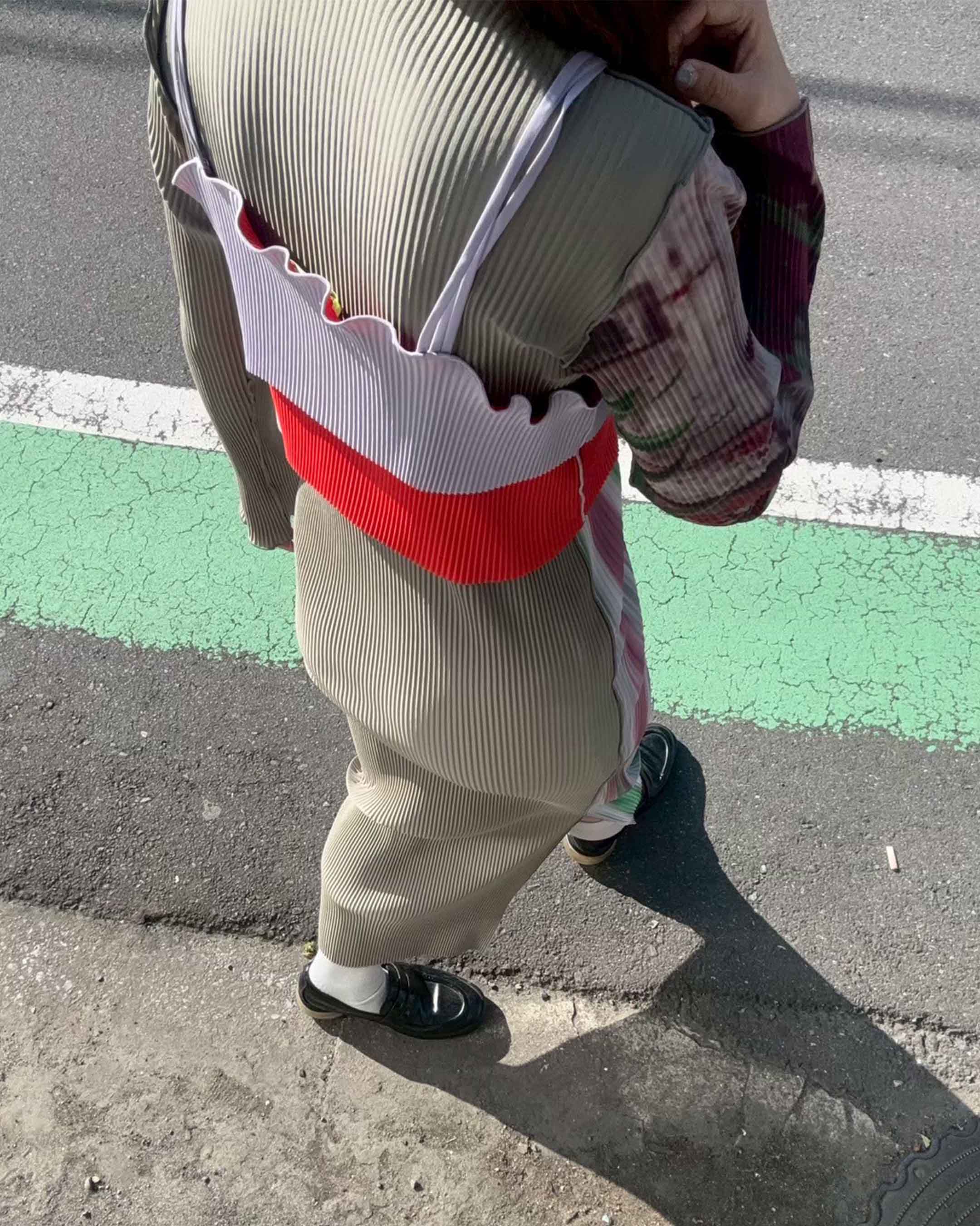 プリーツが消失することがありますので、着用・洗濯の際はご注意ください。プリーツ部分のアイロンのご使用は避けてください。シワが気になる際は、スチームで優しくうかしアイロンをしてください。