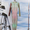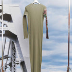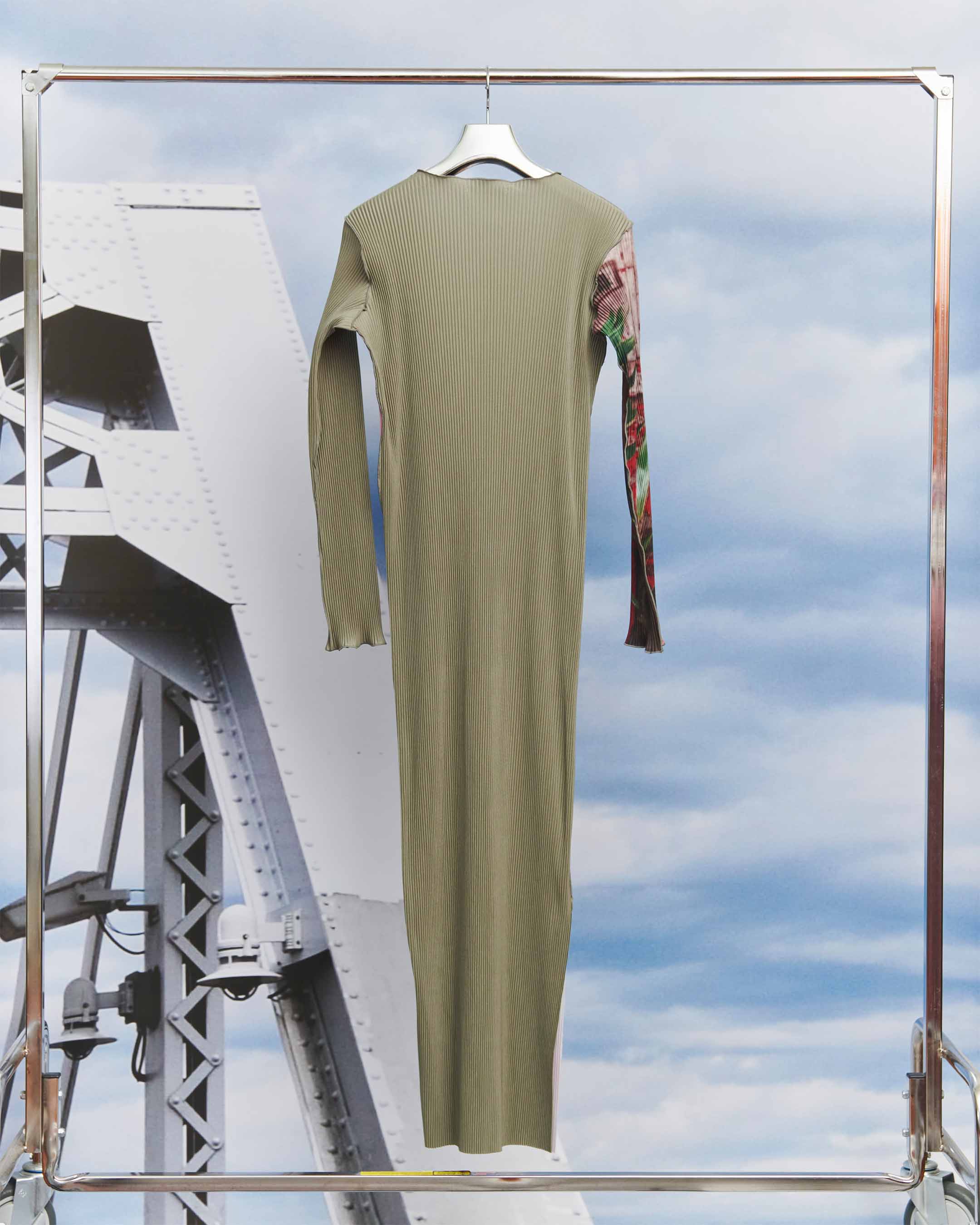 これまでは街の景色が中心でしたが、今回はスタッフ皆で折り染めに挑戦。そこから生まれた柄をモチーフとして使用しています。小学生ぶりに取り組んだ折り染めに熱中し、いつもと違ったムードのグラフィックに仕上がりました。右裾にスリット入り。