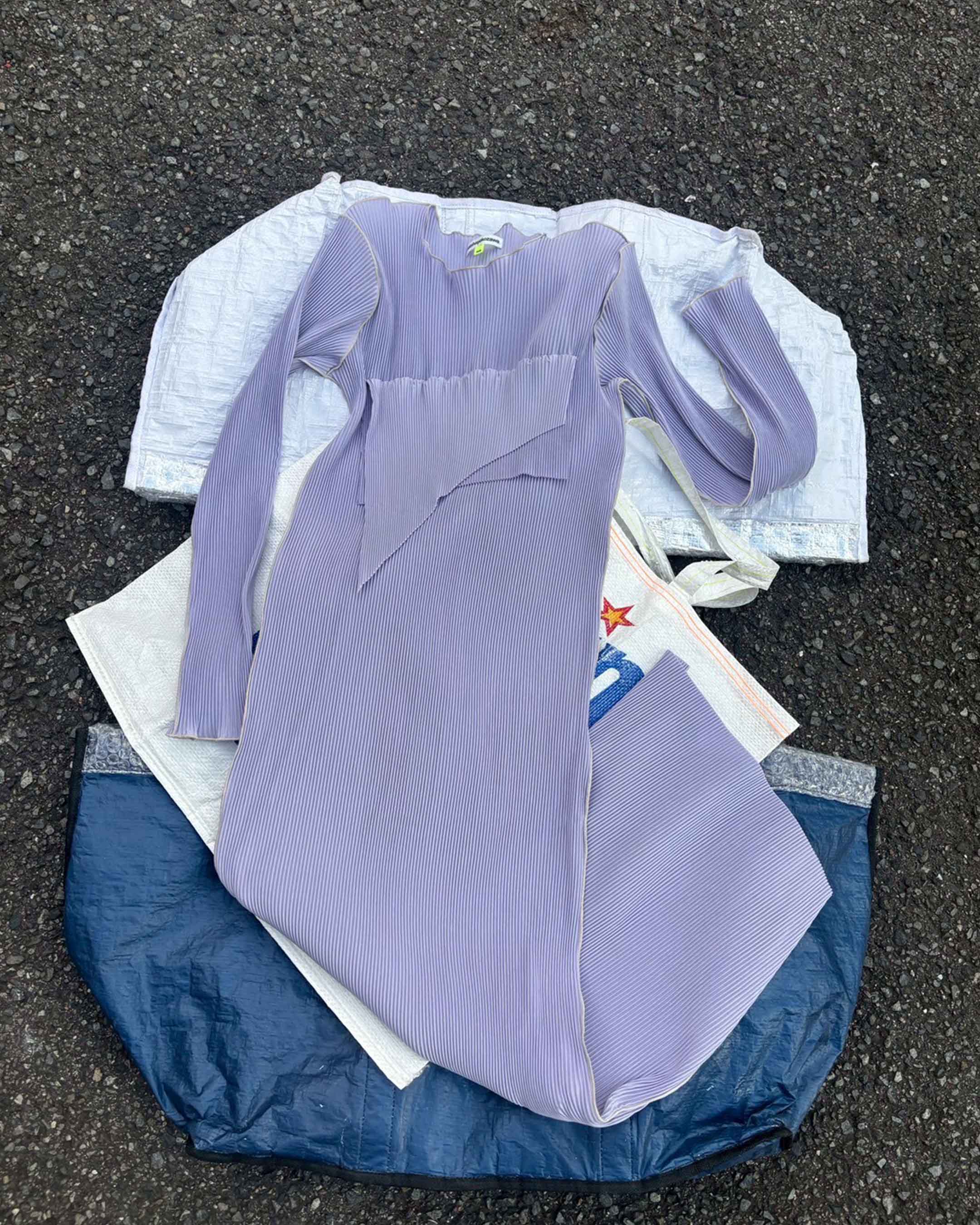 Made from recycled polyester sourced from collected plastic bottles. Dense and sheeny pleated polyester, comfortable for any body shape. Wrinkle-resistant and quick-drying, perfect for travel and everyday wear.