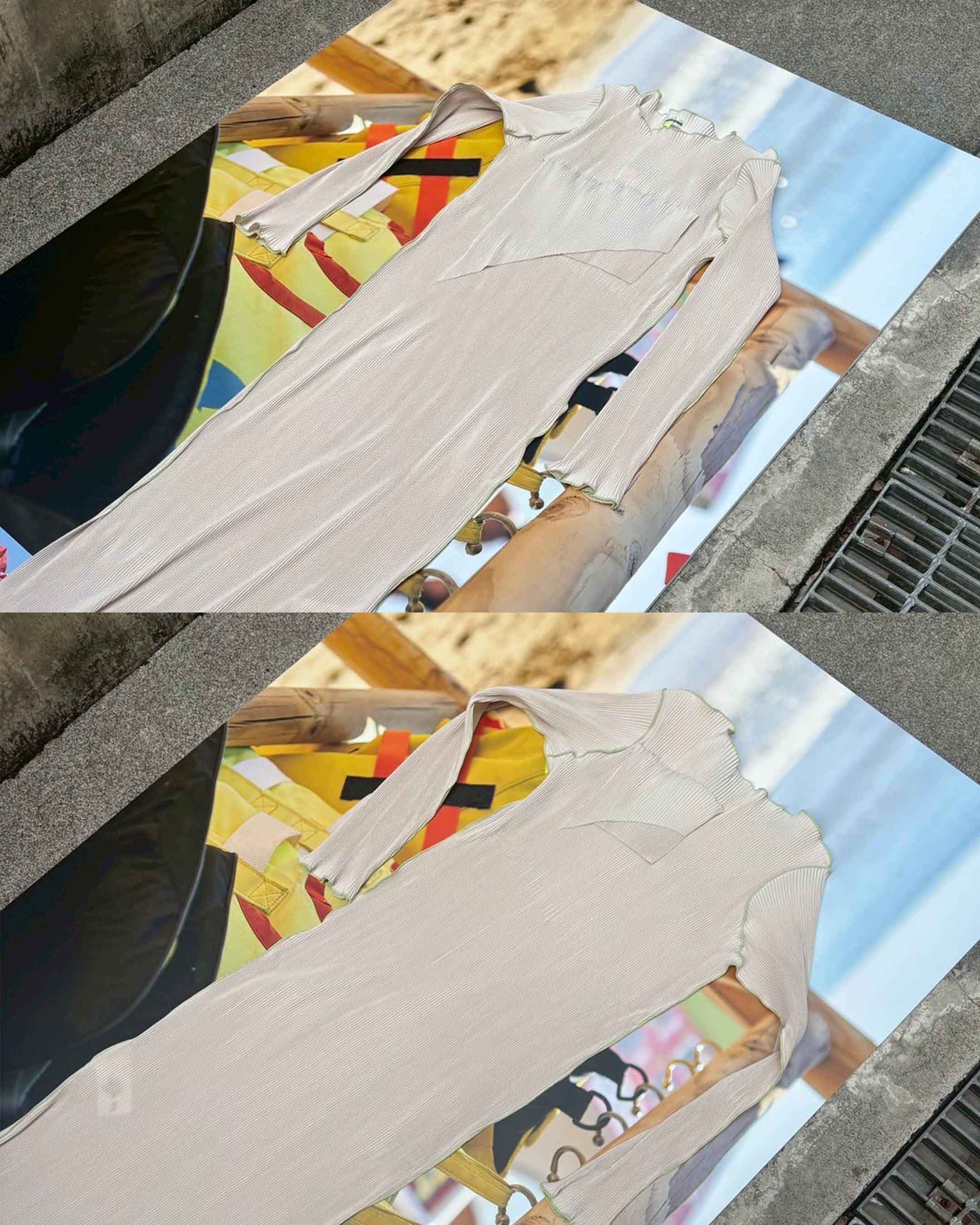 Made from recycled polyester sourced from collected plastic bottles. Dense and sheeny pleated polyester, comfortable for any body shape. Wrinkle-resistant and quick-drying, perfect for travel and everyday wear.