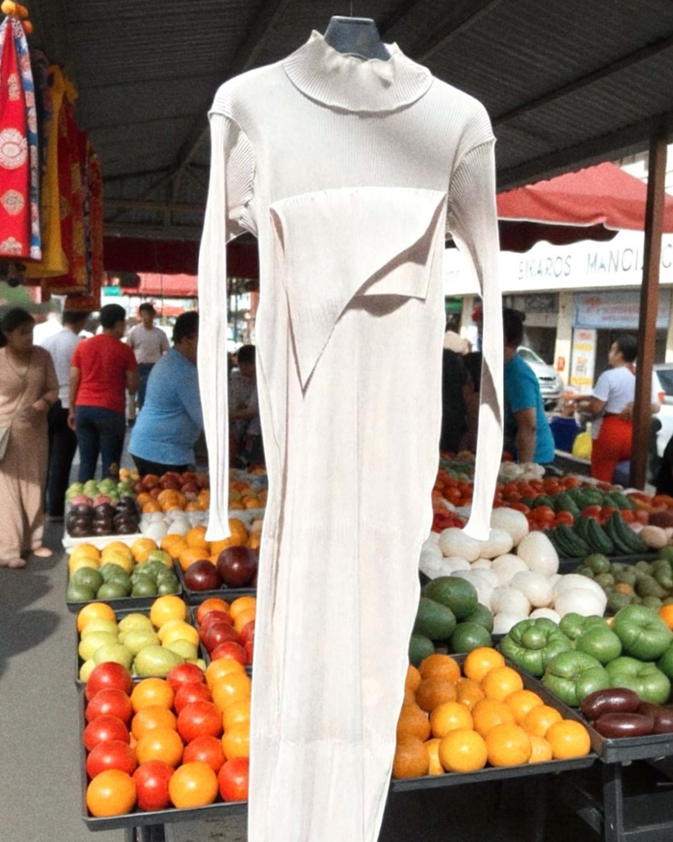 Made from recycled polyester sourced from collected plastic bottles. Dense and sheeny pleated polyester, comfortable for any body shape. Wrinkle-resistant and quick-drying, perfect for travel and everyday wear.