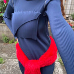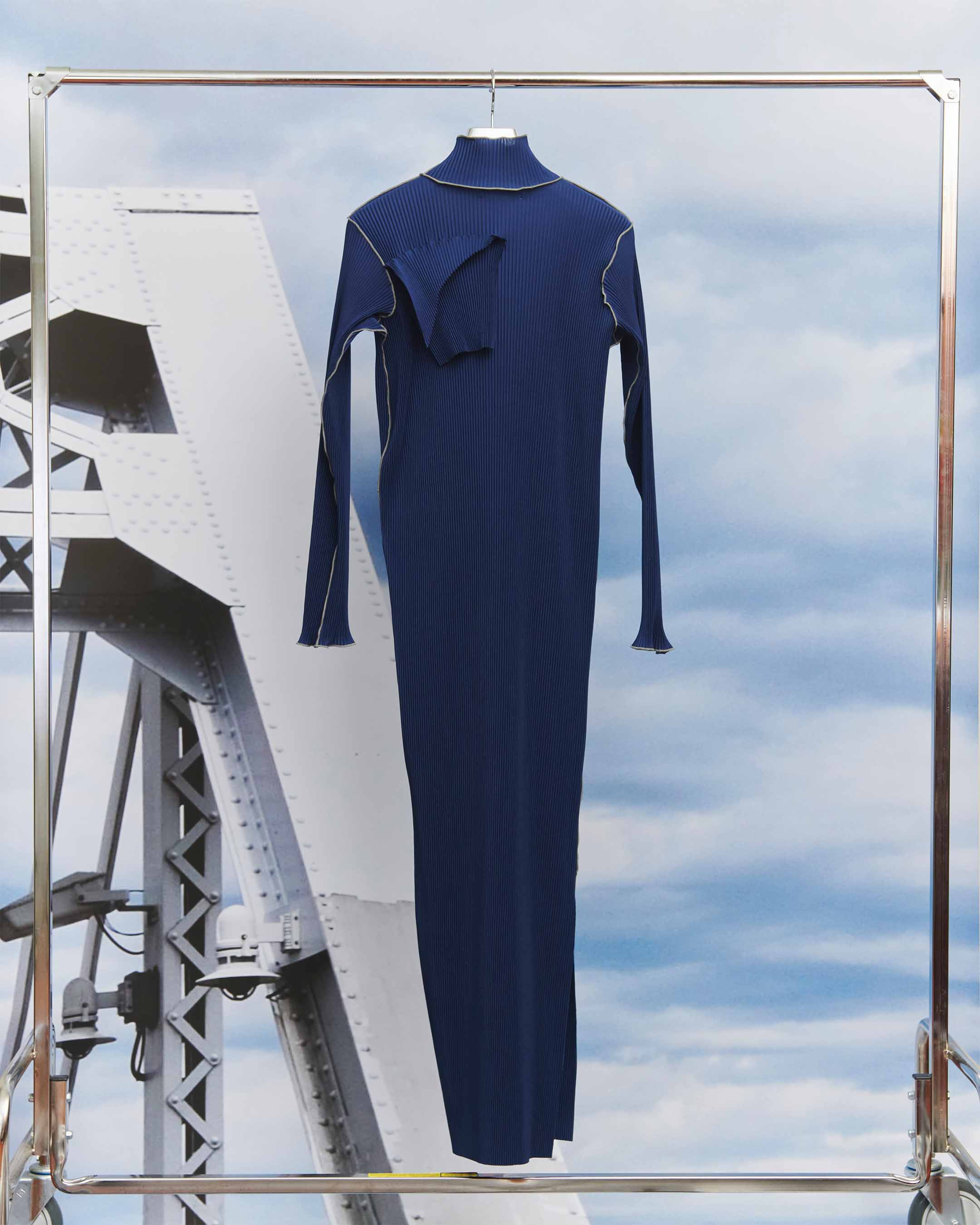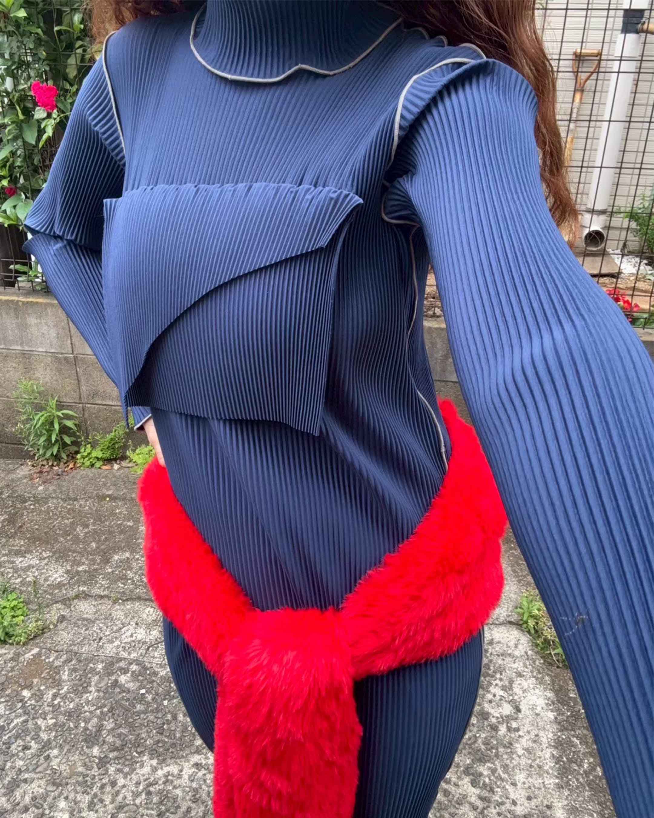 Made from recycled polyester sourced from collected plastic bottles. Dense and sheeny pleated polyester, comfortable for any body shape. Wrinkle-resistant and quick-drying, perfect for travel and everyday wear.
