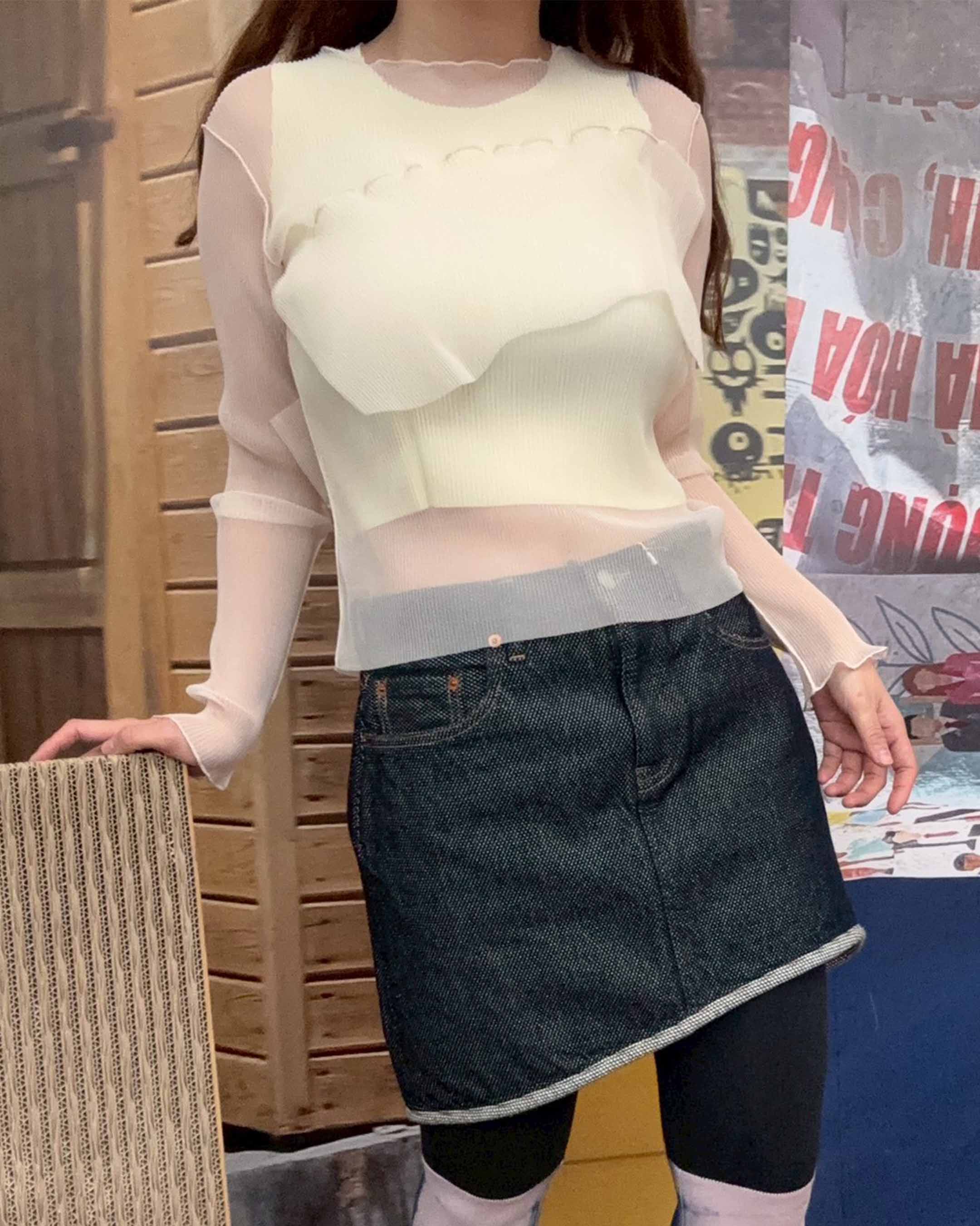 Long-sleeve sheer tulle pleated top with a matching inner set.