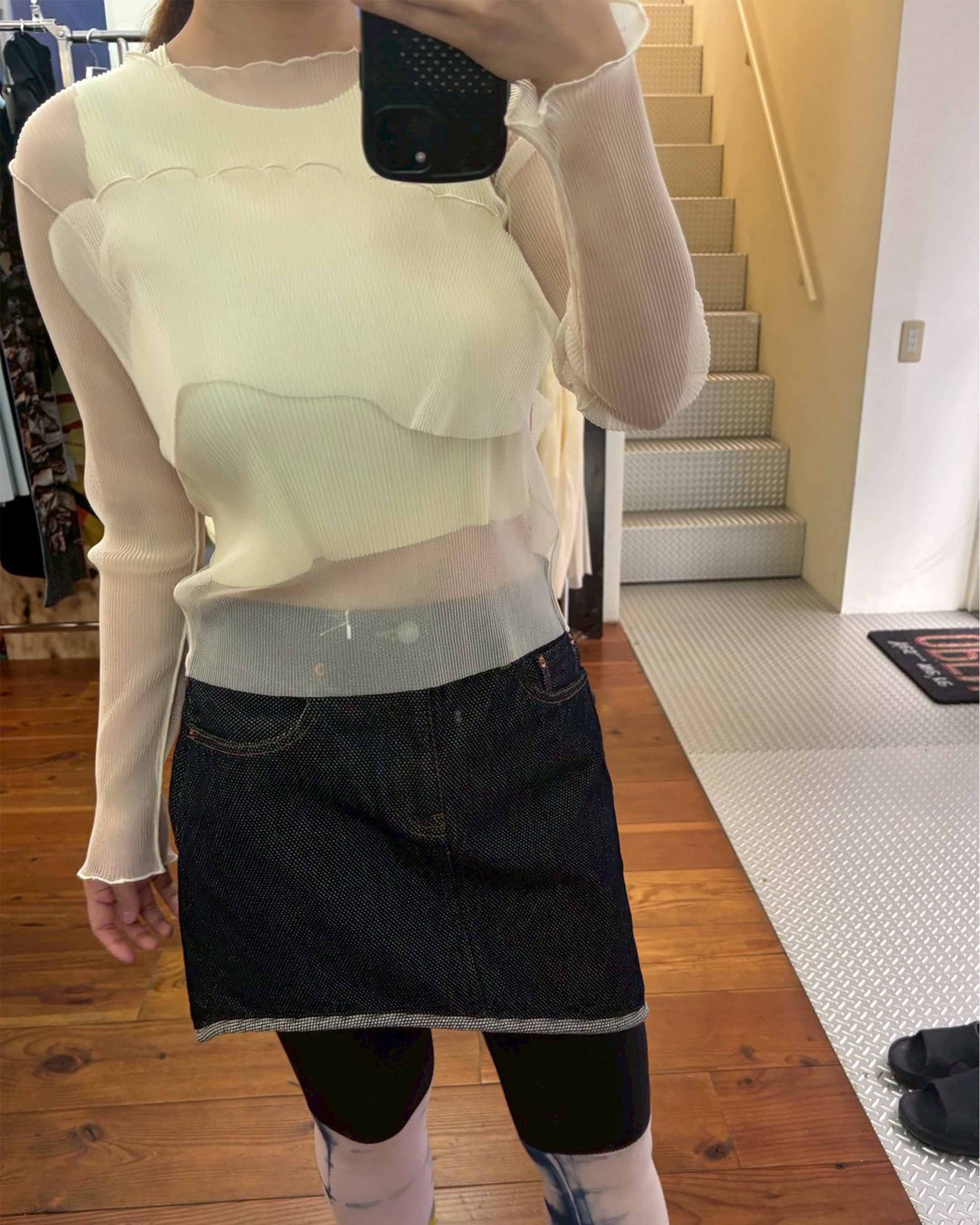 todoの“抜け殻”のように透ける長袖のチュールトップスと、その色を美しく際立たせるインナーを組み合わせたセット。
