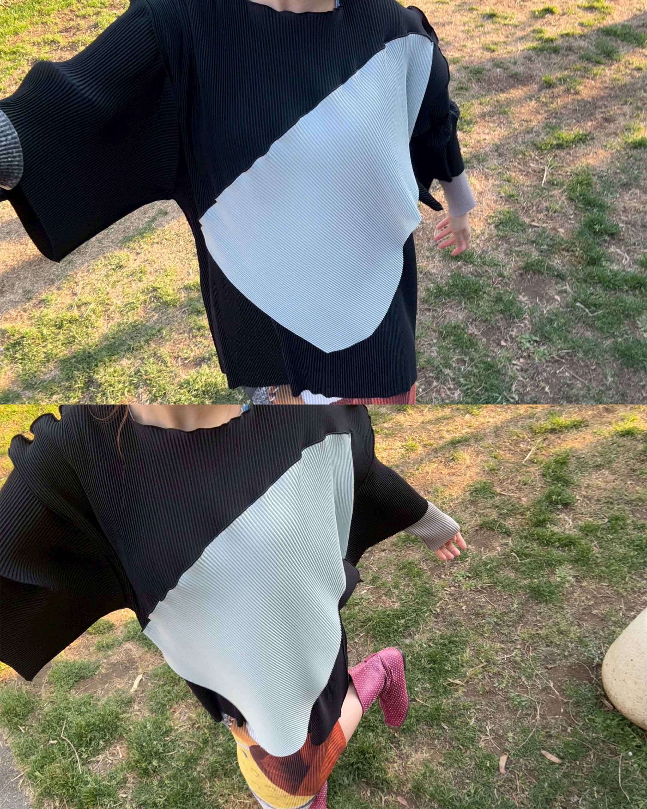 プリーツが消失することがありますので、着用・洗濯の際はご注意ください。プリーツ部分のアイロンのご使用は避けてください。シワが気になる際は、スチームで優しくうかしアイロンをしてください。
